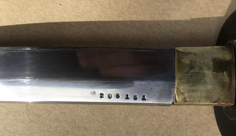 Comes with its all steel scabbard, with as stated before , a non matching serial numbers to the blade. The scabbard with an oxidised finish and looks to have ben lightly lacquered some time ago. This not detracting at all.