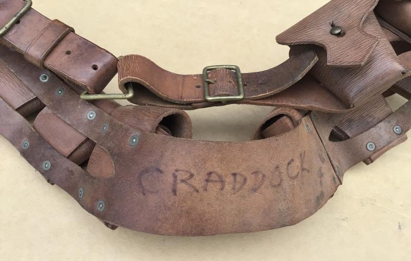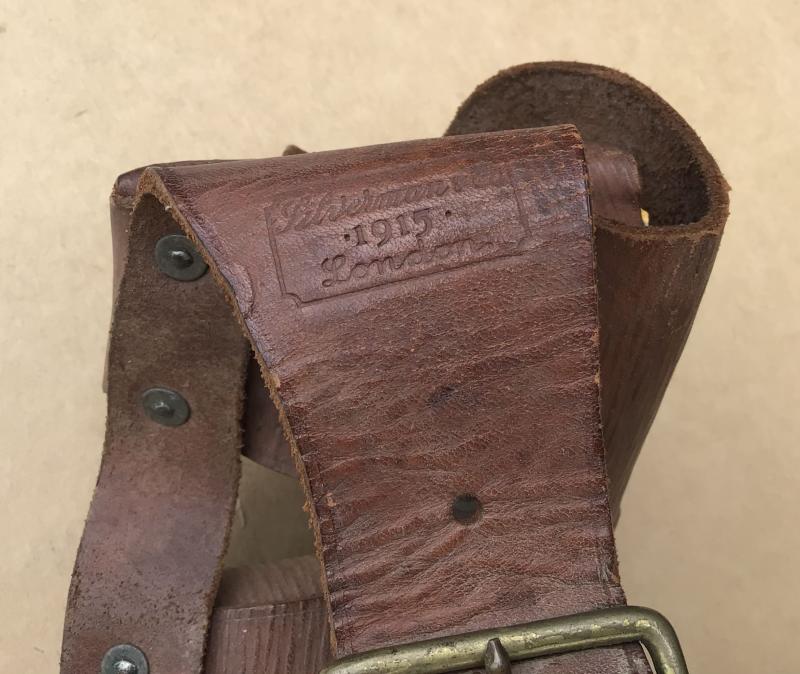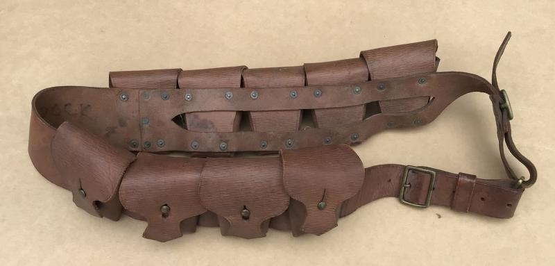 Excellent example. Brown leather 9 pouch bandolier. British made and dated 1915.
