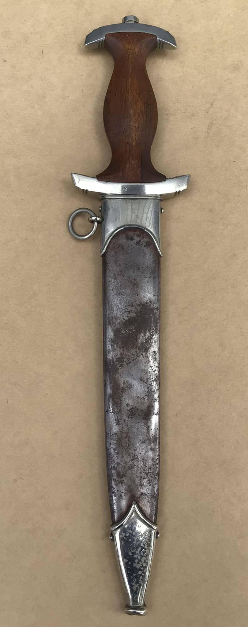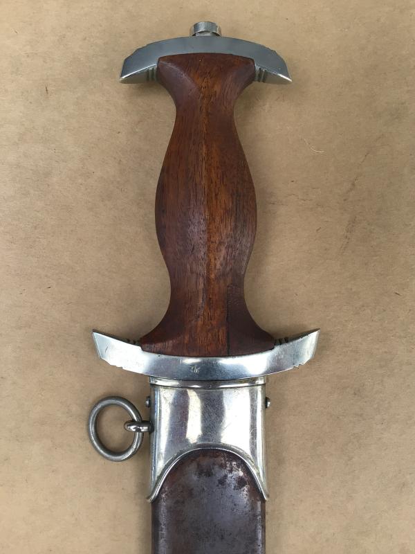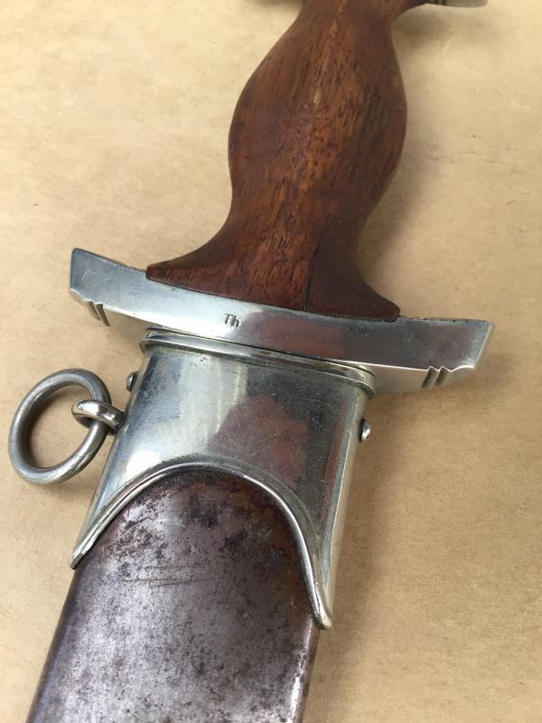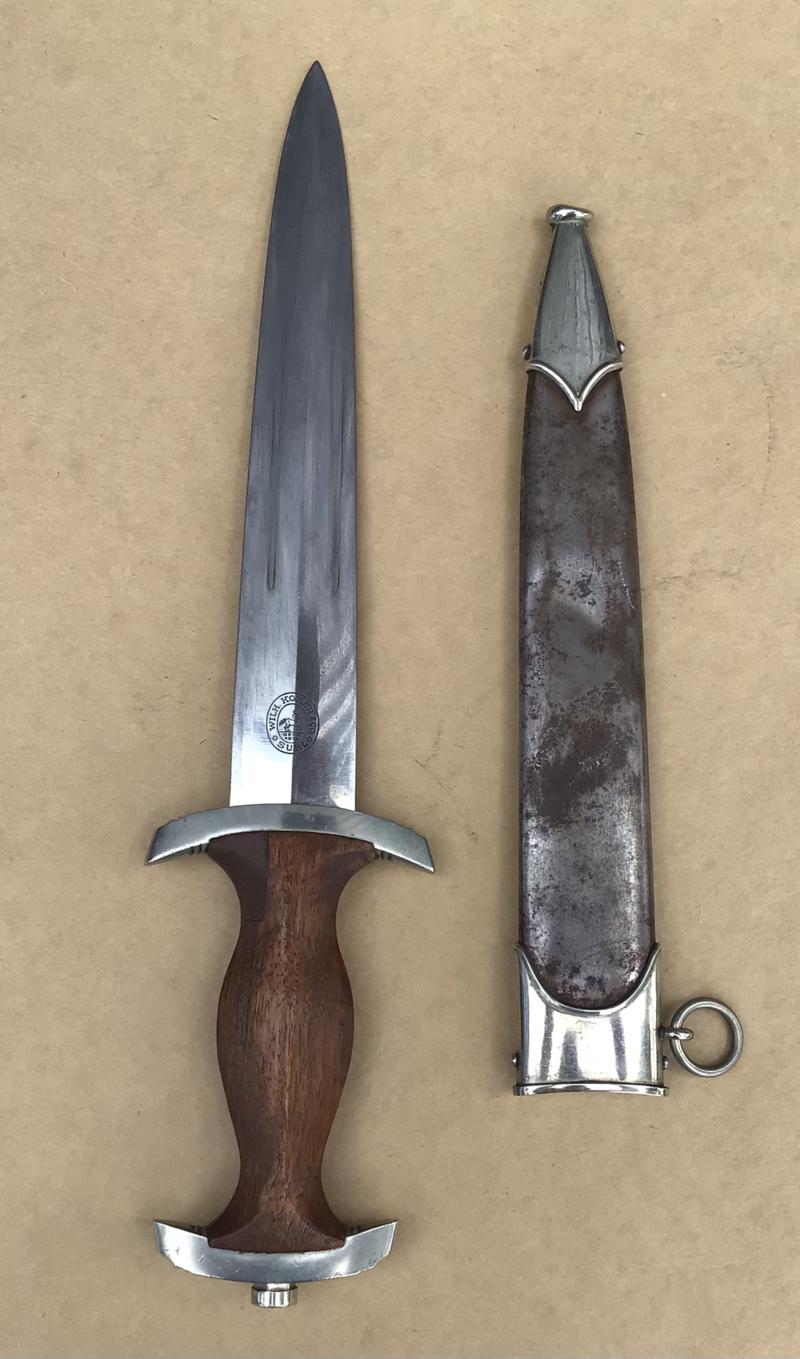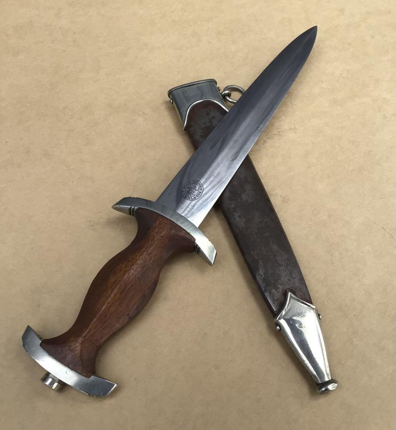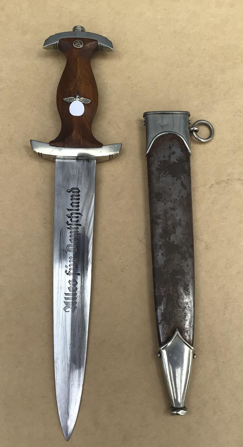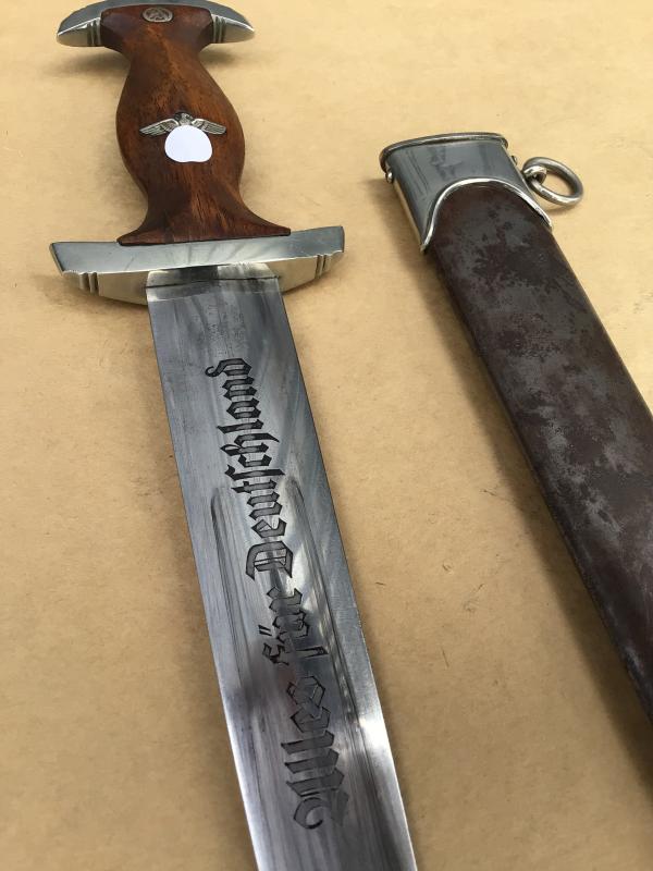 A reasonable example of the SA dagger. Bright blade with motto , this with wear only to the oxidized lettering. The cross guard district marked “Th”. (Thurlingen). Original SA rune disc and party eagle in place. Original wooden grip but has an old repair to the back of the grip with a small replacement piece. This is well done and compliments the existing wood. Comes with an all steel matching scabbard, though this with nearly all of the original brown paint worn off.