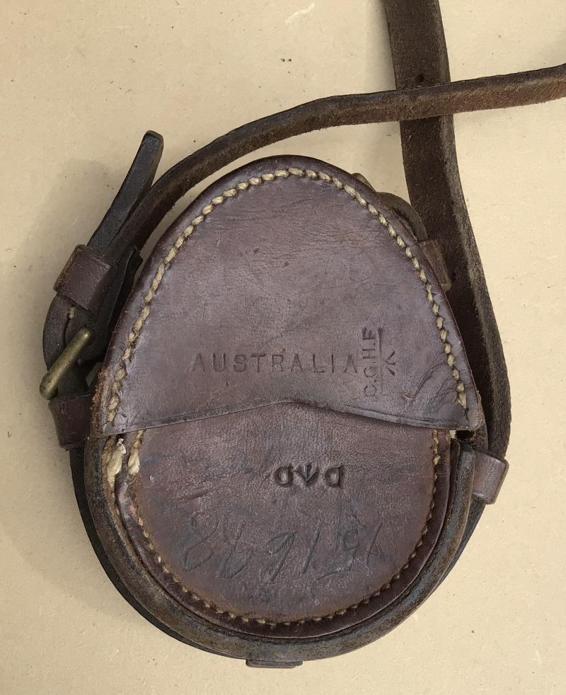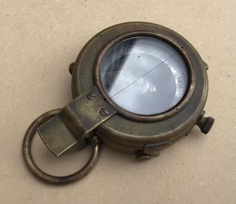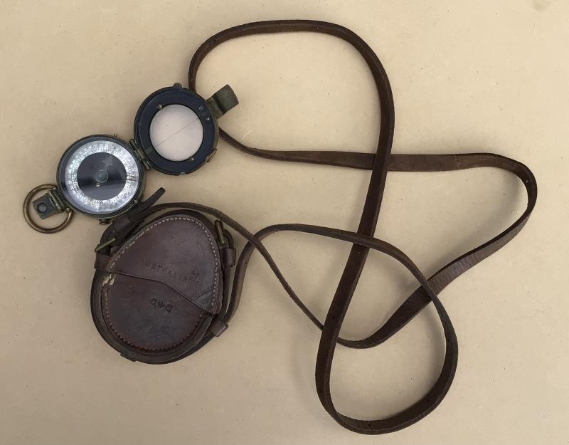 Brass Vernors pattern compass dated 1917. Working order. comes with its brown leather carry case fitted with a shoulder sling. The case well marked various inspection and acceptance stamps nc "CGHF AUSTRALIA" and "D arrow D".