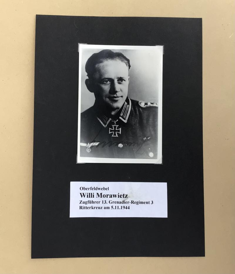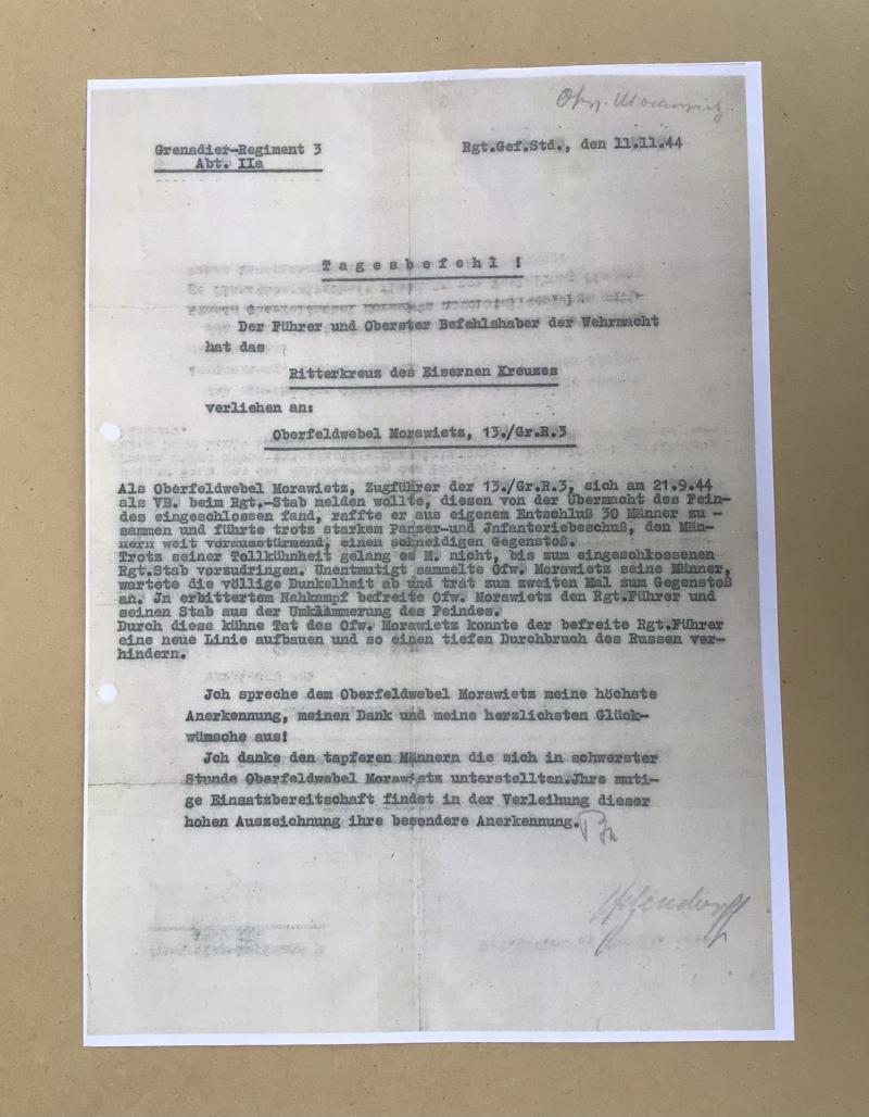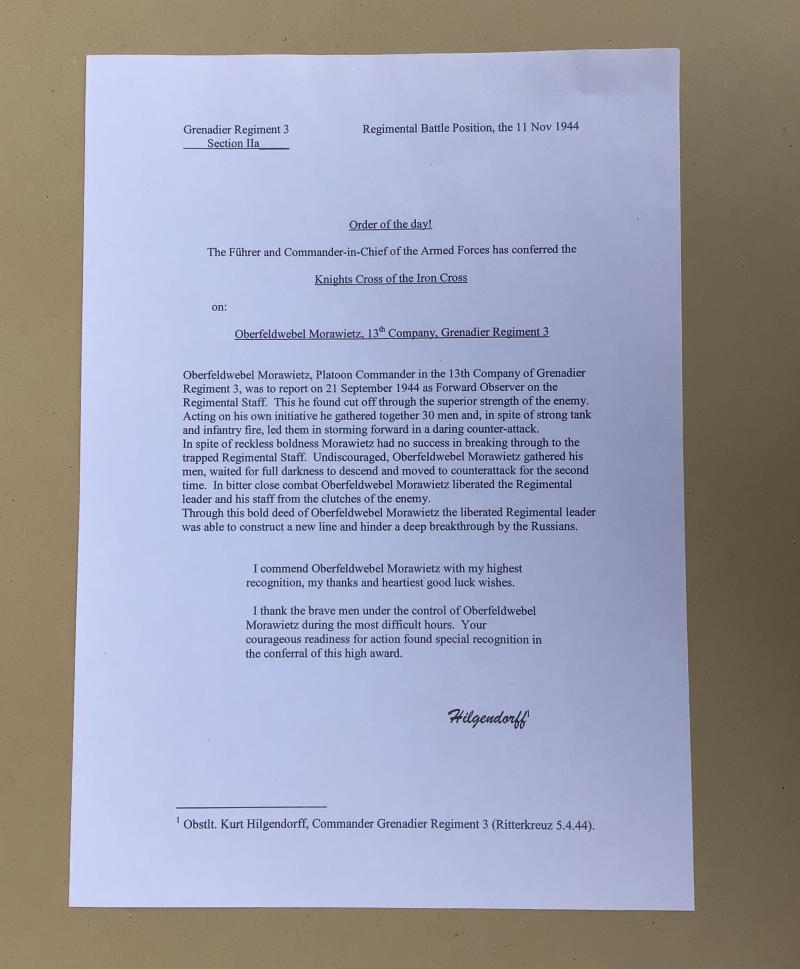 Oberfeldwebel morawietz, a Platoon commader in the 13th Company pf Grenadier Regiment 3 was to report on 21st september 1944 as forward observer of the Regimental Staff. this he found cut off through the superior strength of the enemy. Acting alone on his own initiative he gathered together 30 men and in spite of strong tank and infantry fire, led them in storming forward in a daring counter attack. in spite of reckless boldness Morawietz had no success in breaking through to the trapped Regimental Staff. Undiscouraged, Oberfeldwebel Morawietz gathered his men ,waited for full darkness to defend and moved to counter attack for the second time. In bitter close combat Oberfeldwebel Morawietz liberated the Regimental leader and his staff from the clutches of the enemy. Through this bold deed of Oberfeldwebel Morawietz, the liberated Regimental leader was able to construct a new line and hinder a deep breakthrough by the Russians. I commend Oberfeldwebel Morawietz with my highest recognition , my thanks and heartiest good luck wishes. i thank the brave men under control of Oberfeldwel Morawietz during the most difficult houe=rs . Your courageous readiness for actin found special resignation for action found special regingition in the conferral of this high award. , Obslt. Kurt Hilgendorff, Commnader Grenadier Regt. 3.