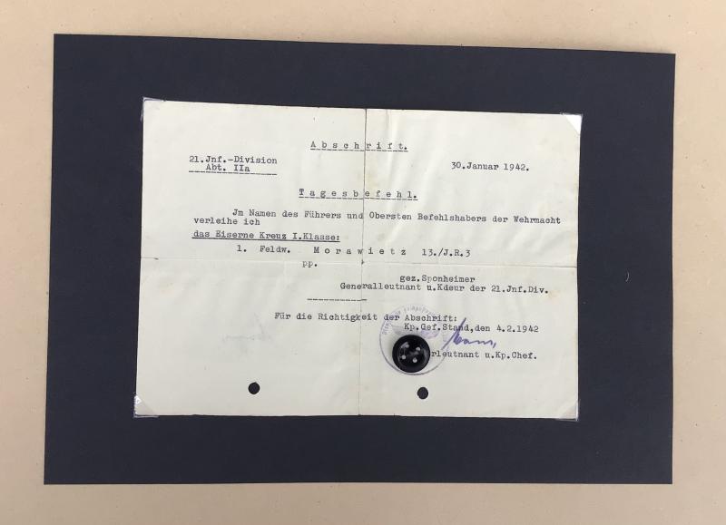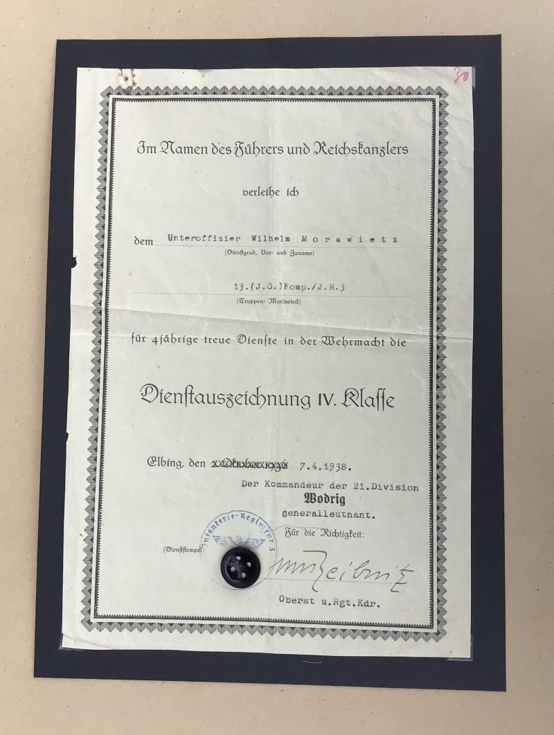 The original award certificates for the Army 4 Year Loyal Service Medal, then serving with Infantry regiment 3 and dated April 1938, and the original preliminary field award document for the 1939 Iron Cross 1st Class award to Morawietz in January 1942 again serving with Infantry Regiment 3.