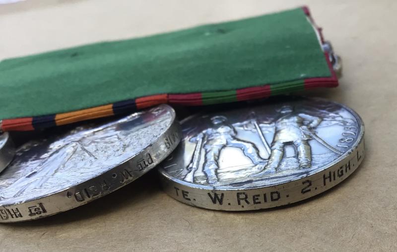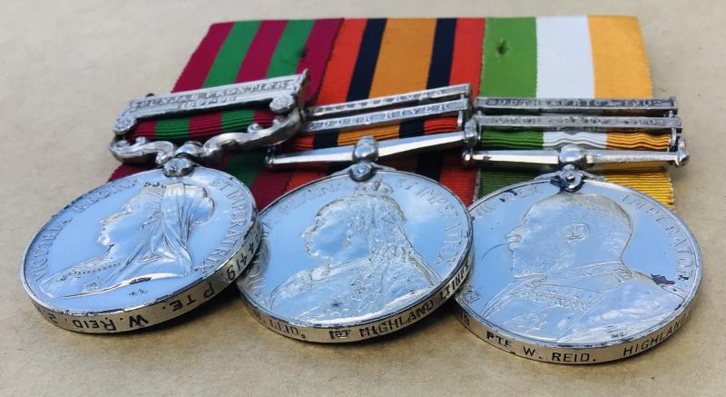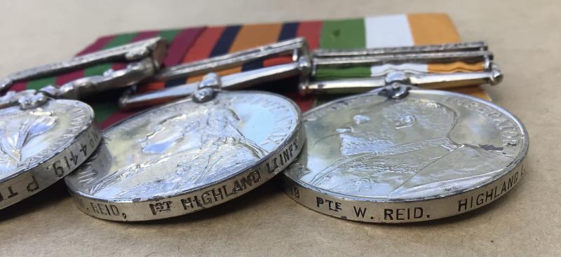 India Medal 1896 , clasp Punjab Frontier 1897-98 (engraved large Roman capitals No.4419 PTE W REID 2 HIGH L I) Queens South Africa Medal with two clasps “Modder River, Wittebergen” ( impressed 4419 PTE W REID 1st HIGHLAND LT INFY), Kings South Africa Medal , two clasps “South Africa 1901, South Africa 1902” ( impressed 4419 PTE W REID HIGHLAND LI).