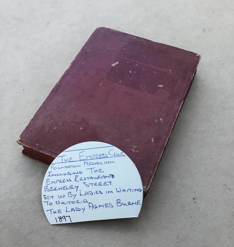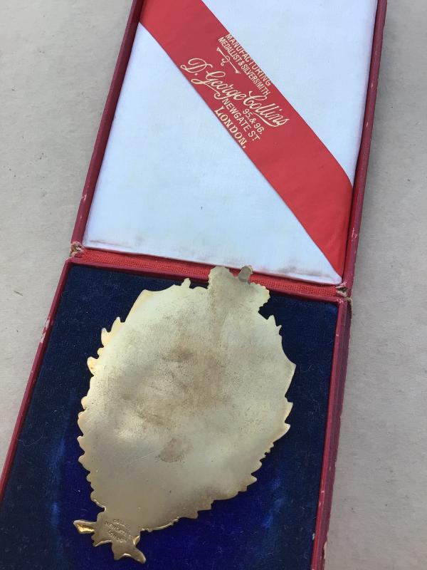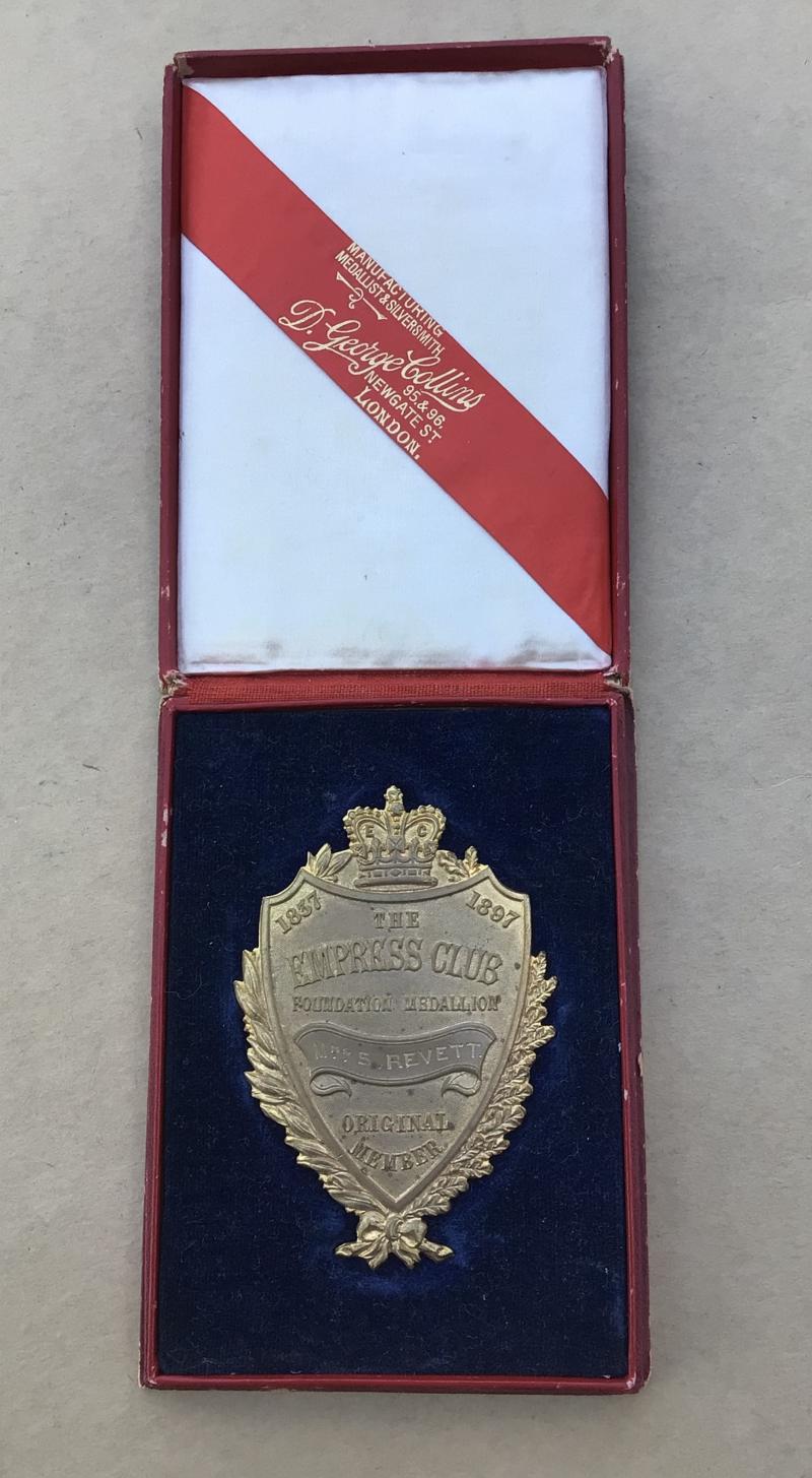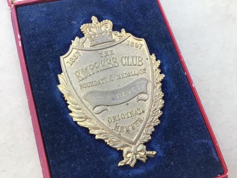1897 Empress Club Medallion. Gilt brass with maker marks on the plain reverse. Named to Mrs S Revett. In a fitted red leatherette case of issue by George Collins, London. Medallion approx 85mm.