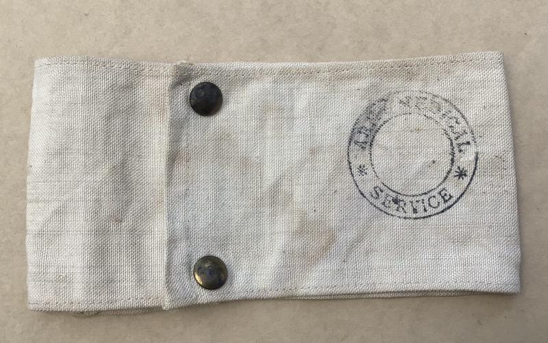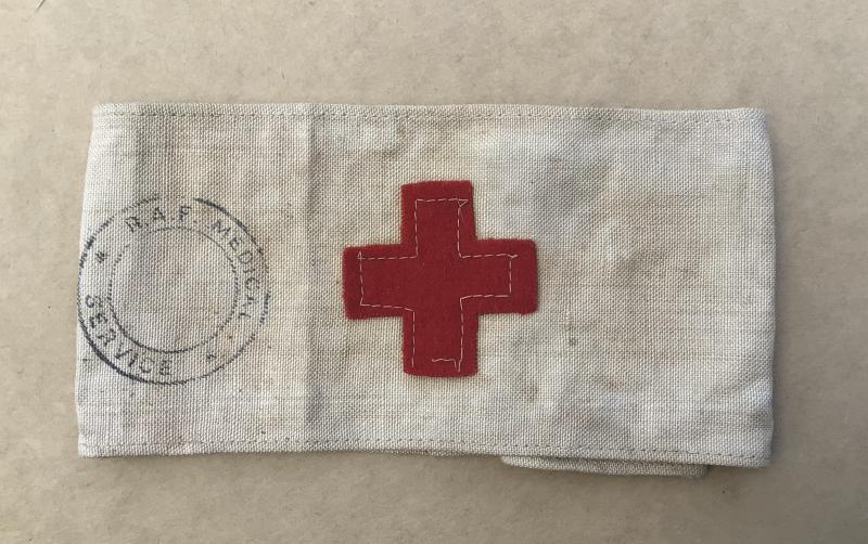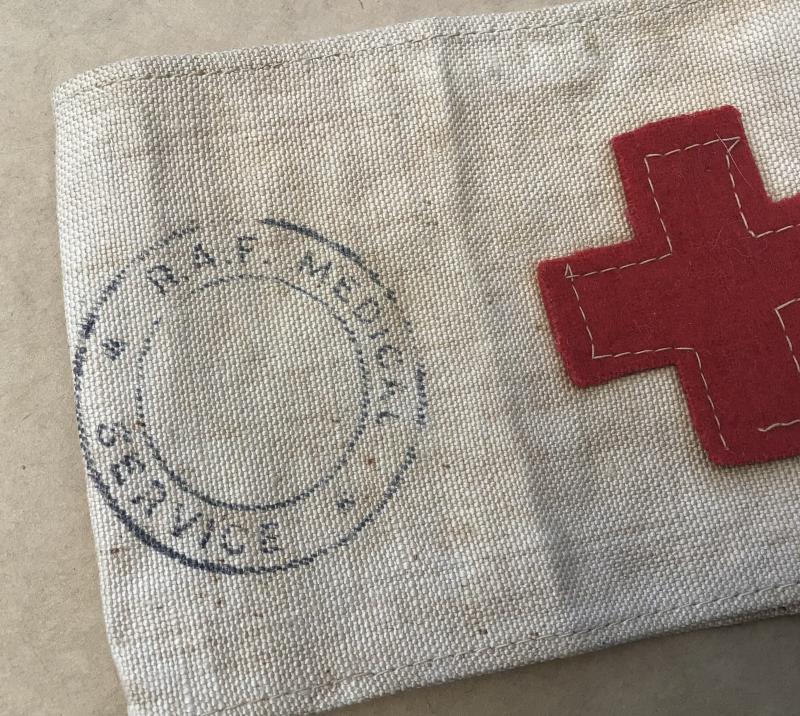 White calico with red wool felt Geneva cross. Press stud reverse. Has both ink stamps for Army Medical Service as well as RAF Medical Service.