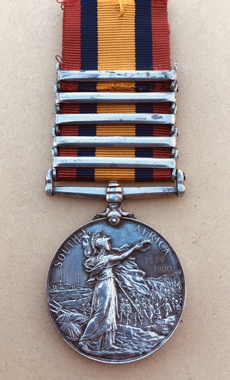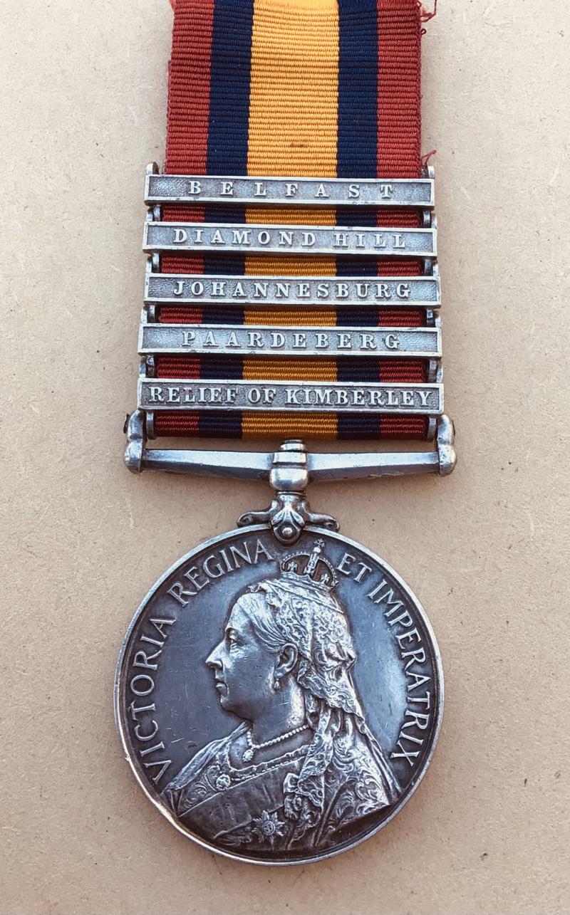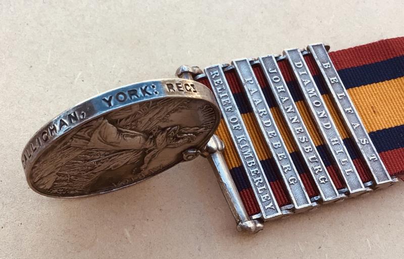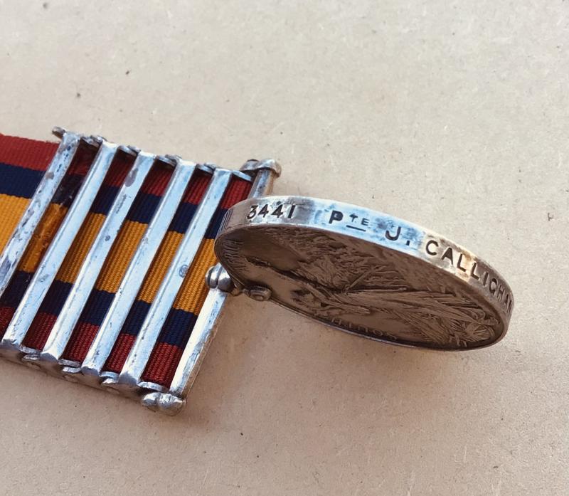 4 Clasps. “ Relief of Kimberley, Paarderberg, Johannesburg, Diamond Hill, Belfast”. Impressed “ 3441 PTE J CALLIGHAN YORK REGT”. Original full size medal.