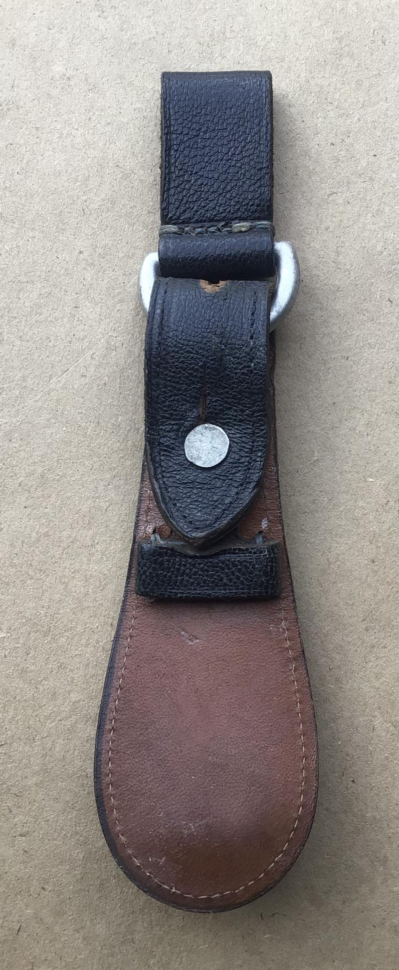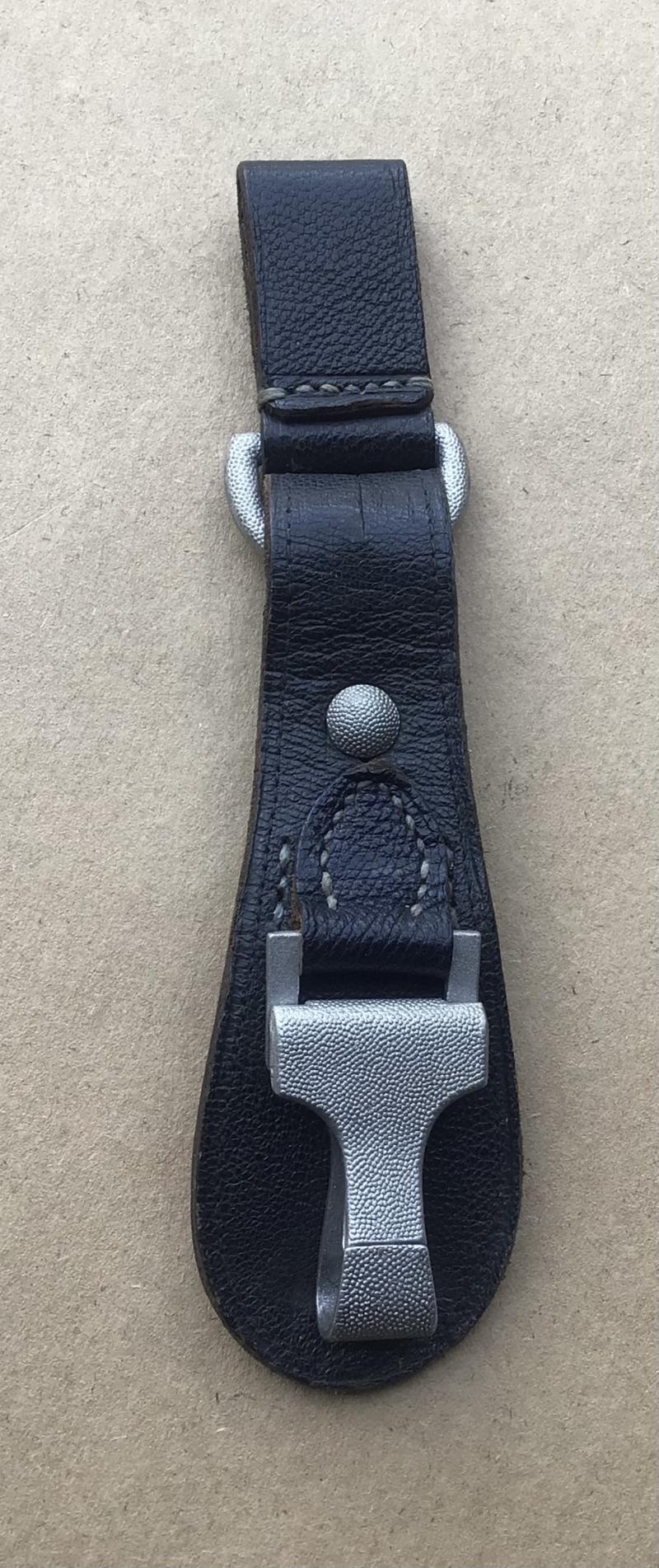 Moroccan blue leather tear drop hanger fitted with metal spring clip for attachment to the sword scabbard and with matching leather belt loop. A very nice hanger and hard to find. Excellent condition.