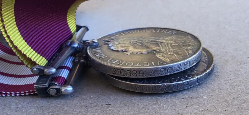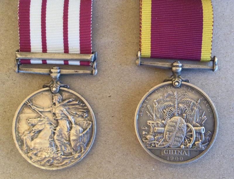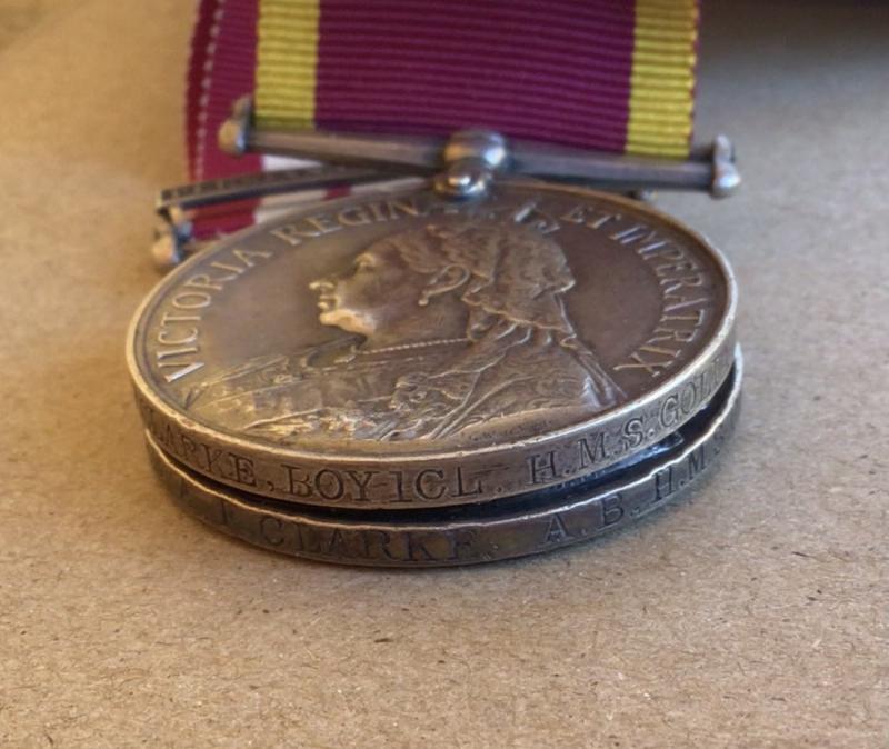 China Medal 1900 ( Boxer Rebellion) ,no clasp, impressed “201389 A F CLARKE BOY 1CL HMS GOLIATH”, Royal Naval General Service Medal (GVR) , clasp “ Persian Gulf 1909-1914 , impressed “201389 A F CLARKE A B HMS ODIN”.