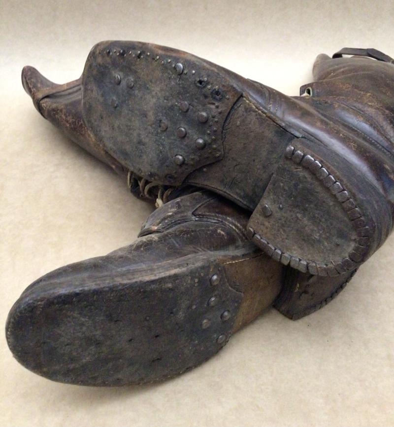 All brown leather with leather soles. Half lace boots with laces and "0" style brass eyelets and having cavalry style top calf strap. No markings remaining. The soles with only some of the original hob nails remaining. Overall wear with use and age.