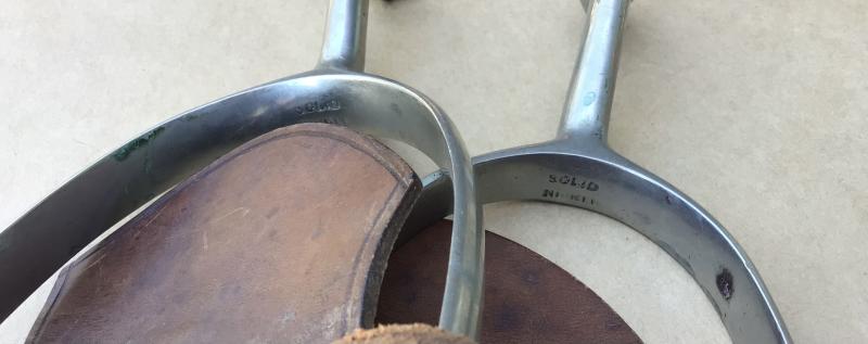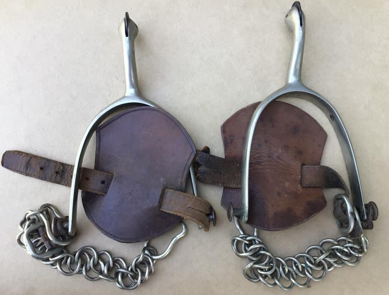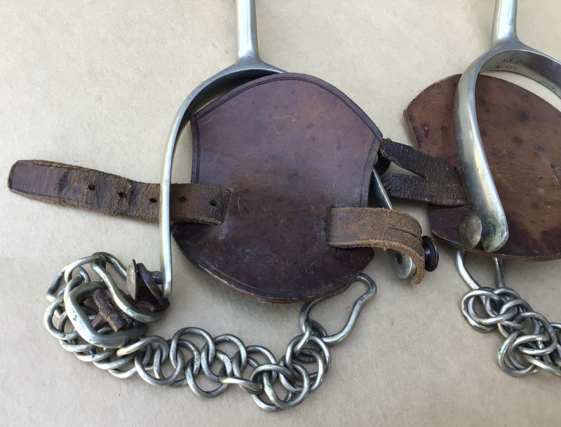 A good matched pair complete with chains, leather straps and butterflies. The leather strap dry and damaged at one end. The rowels are British silver coins. The date not visible.