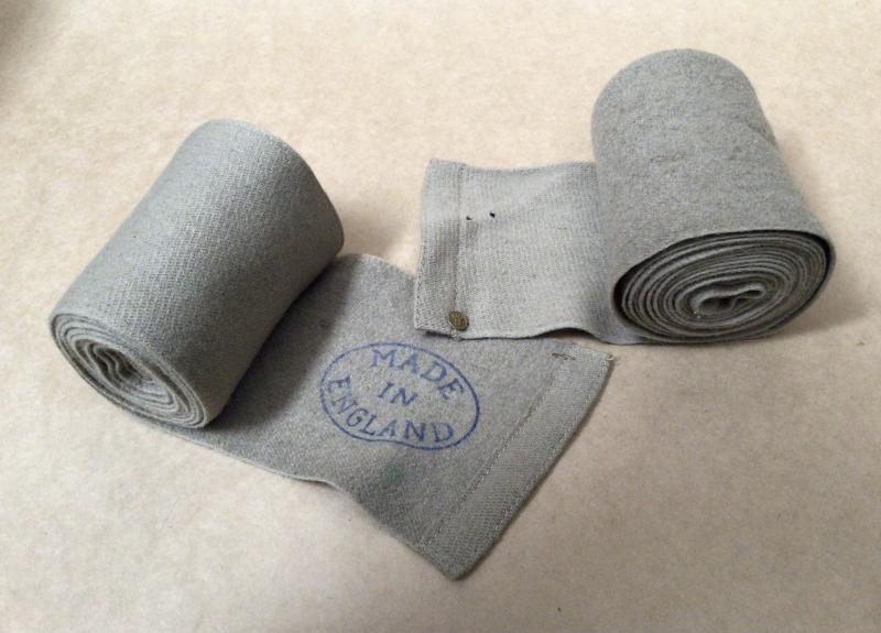 WW1 Private Purchase Fox Puttees - Long. Military or Sportsman's Mouse grey-brown wool. Each with a small copper "Fox" tag and "Made in England" ink stamp.