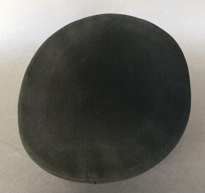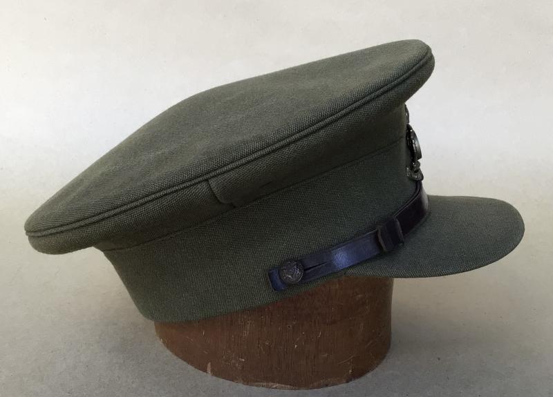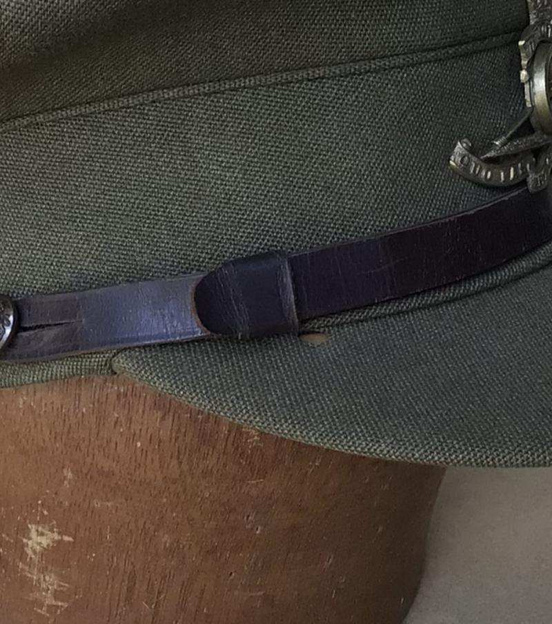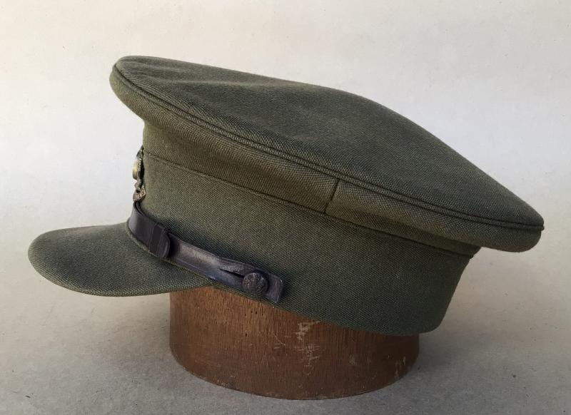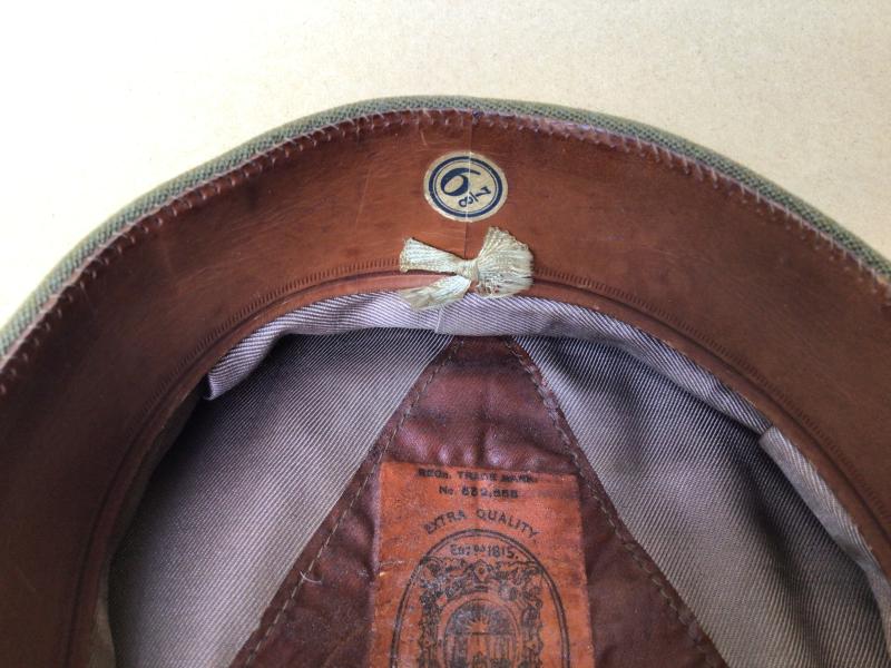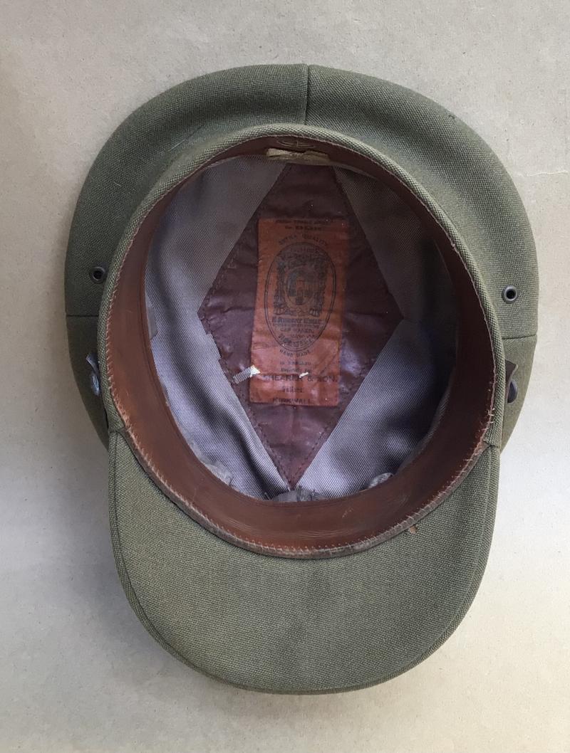 Khaki wool with brown leather chinstrap secured with oxidized General servcie buttons. Artillery officers hat badge. Has evidence of another previous badge but concealed behind the artillery badge. Brown leather sweatband and makers label on the inside lining. Nice overall shape and general condition with general service wearing.
