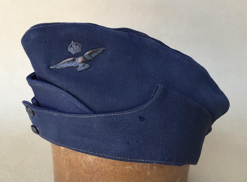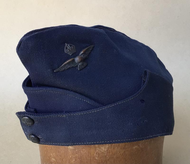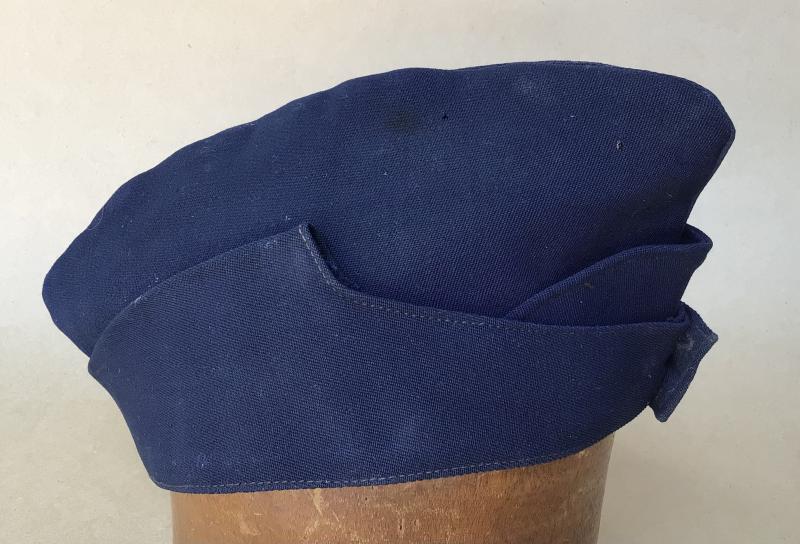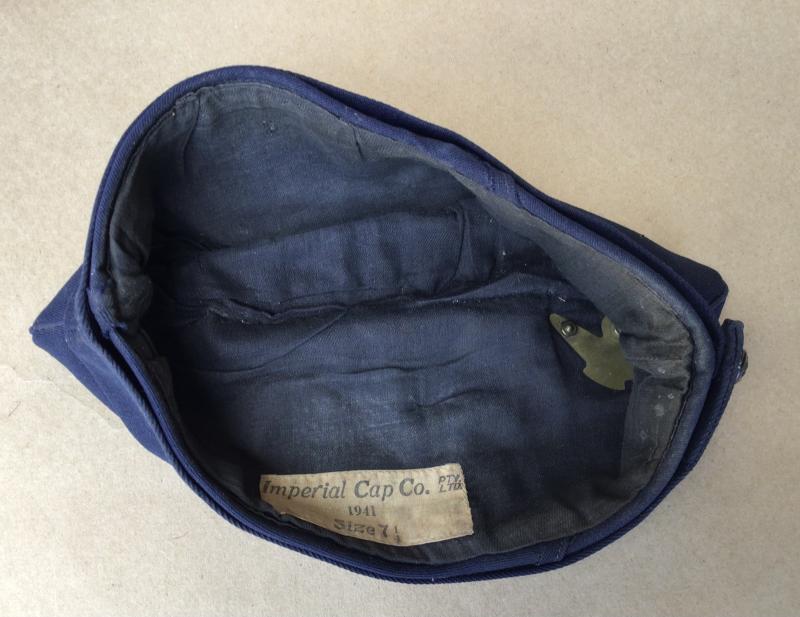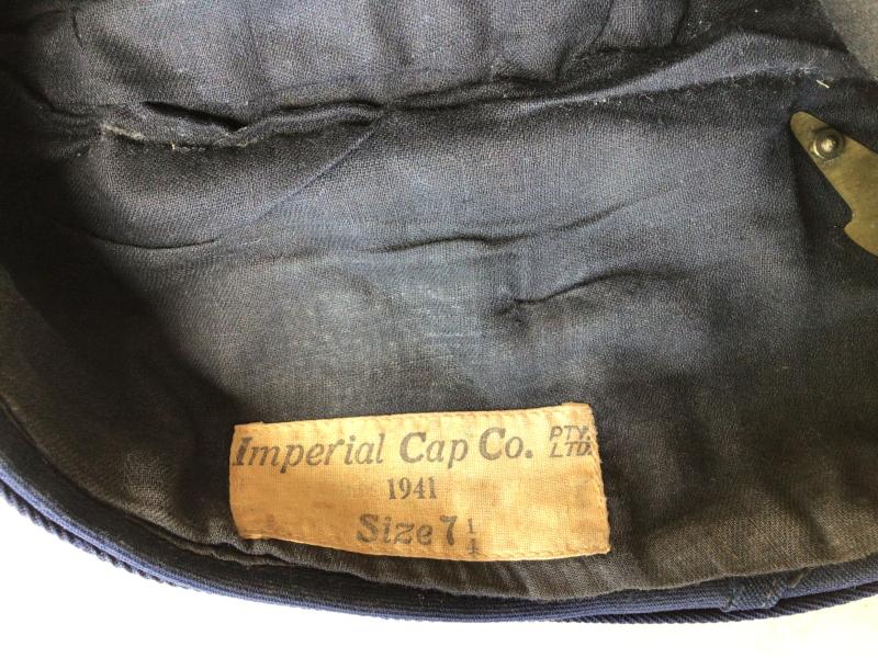 A well service used cap. Dark blue wool of the officers pattern. Complete with oxidized cap eagle. Made by Imperial Cap Company. (Possibly UK or Canadian made?)and dated 1941. Some light moth and shows soiling and age consummate with age.