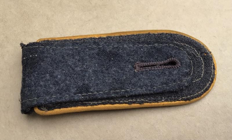 Detachable type in blue grey wool with silver NCO tresse and single aluminum rank pip. Yellow piping for Flight section/Paratroop.