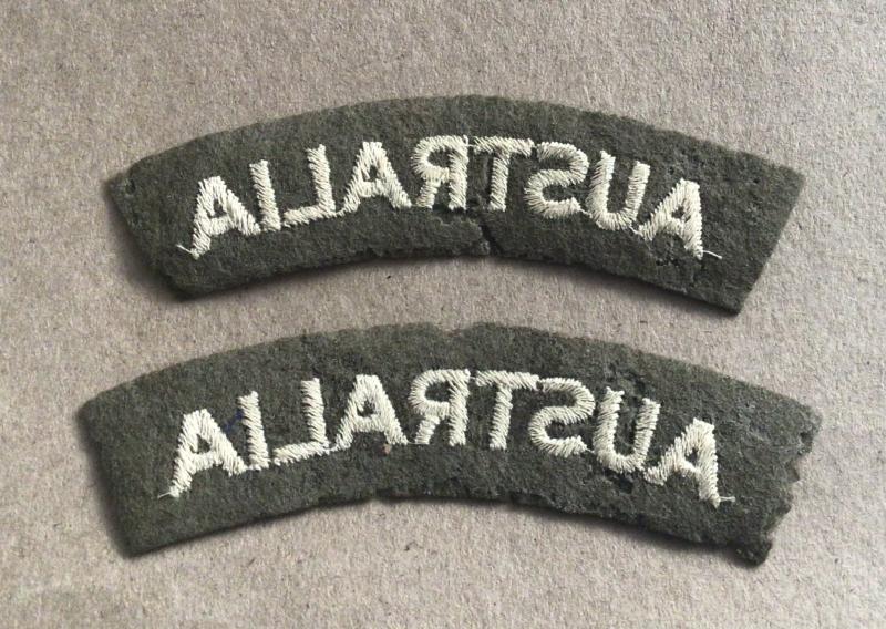 A rare pair of cloth titles of white worsted on khaki wool. Predominantly worn on greatcoats. UK manufacturer. In 1917 an AIF directive was issued to advise that the wearing of these and other unauthorized badges was to cease.