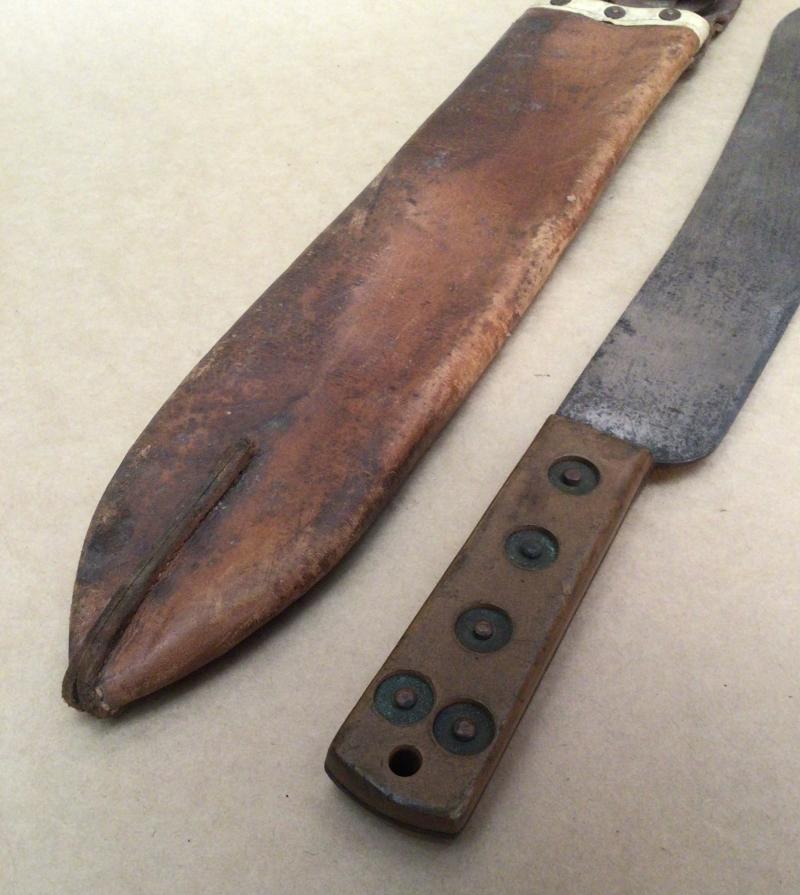 Comes with its brown leather sheath, this with some age stain but nice and supple and fits well to the machete. (No markings).