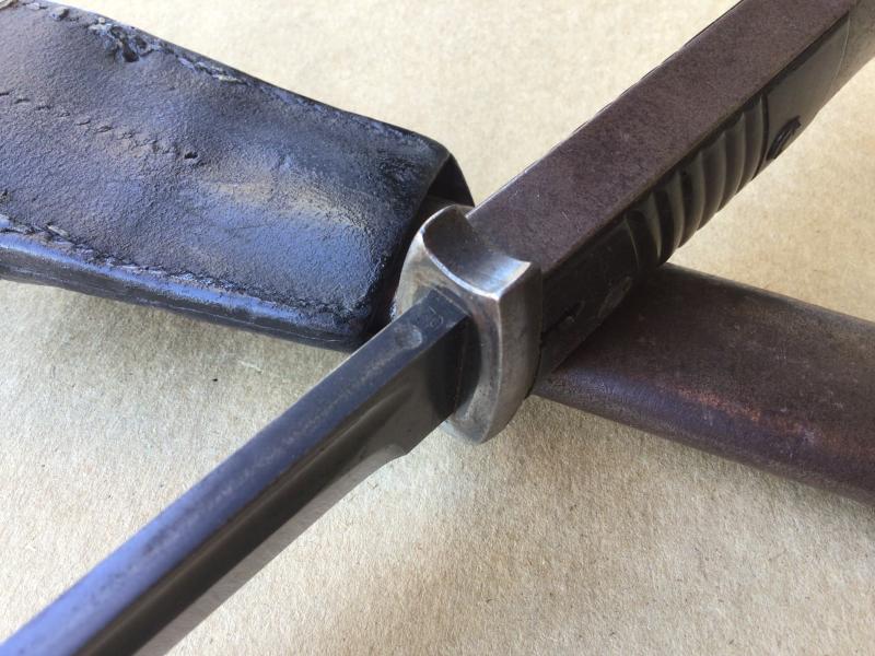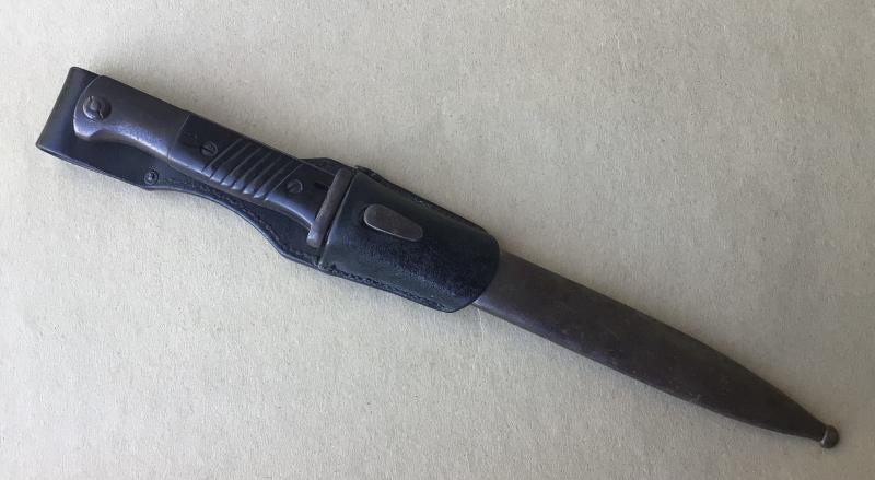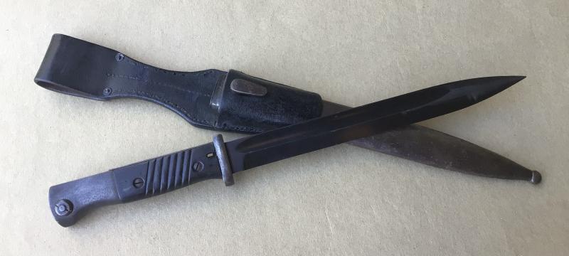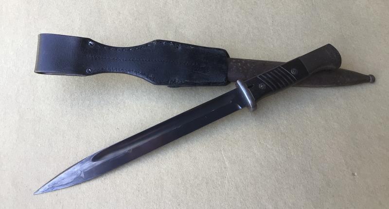 Blade with much of the original finish by Alexander Coppel and dated 1939. Has the Waffenamt acceptance stamps. Bakelite grips and working locking stud. Comes with black leather scabbard.