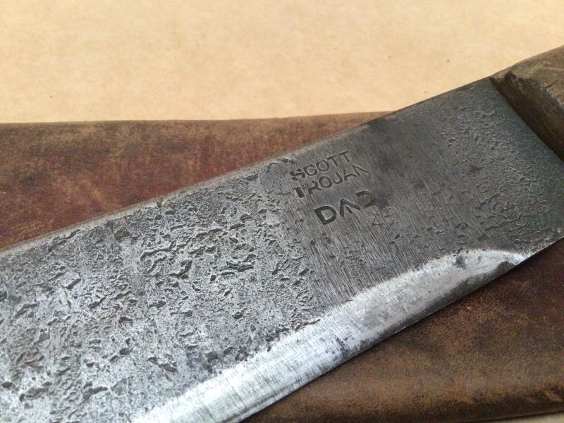 The late bolo blade marked "D arrow D" "Scott Trojan". Original wood grips in good condition.