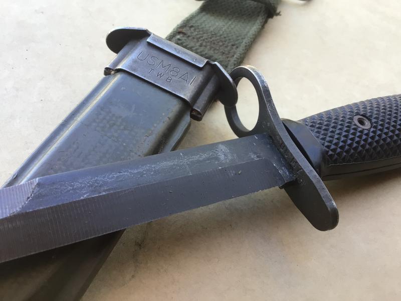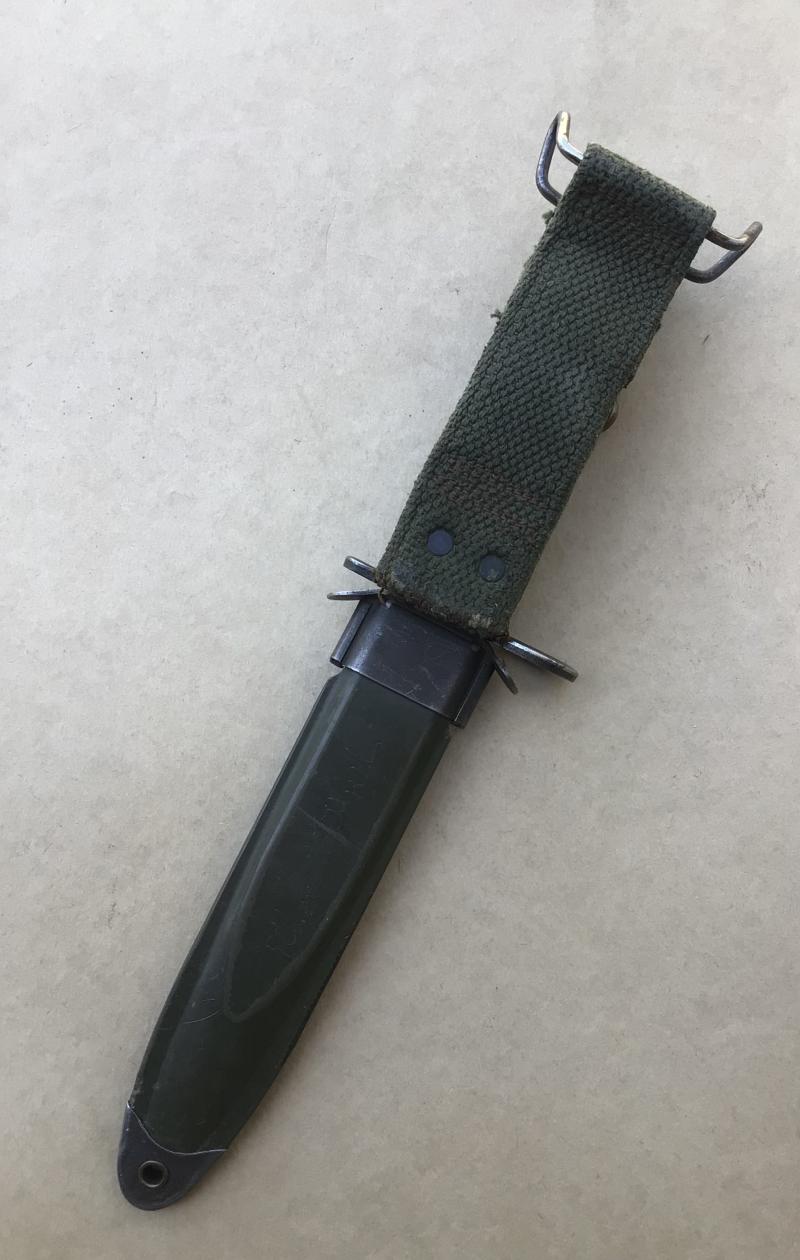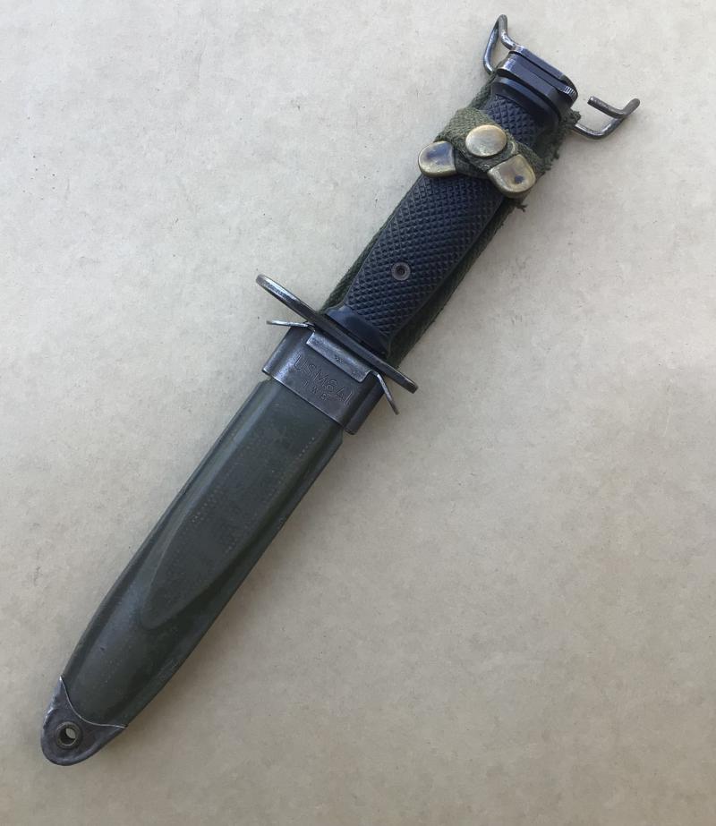 Black plastic grips. Working locking ring. Maker marked BOC. Comes with fiber scabbard. Overall good used condition.