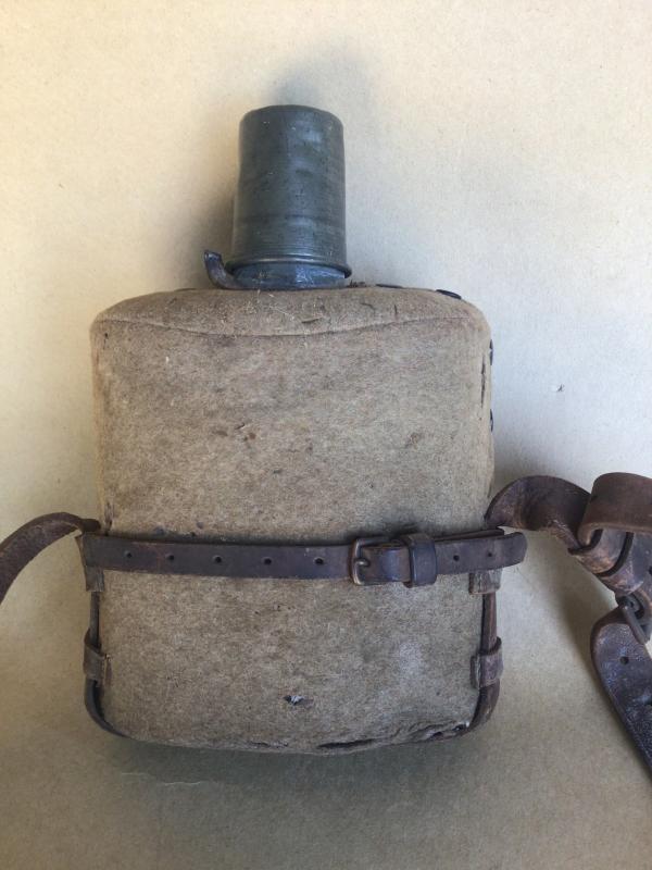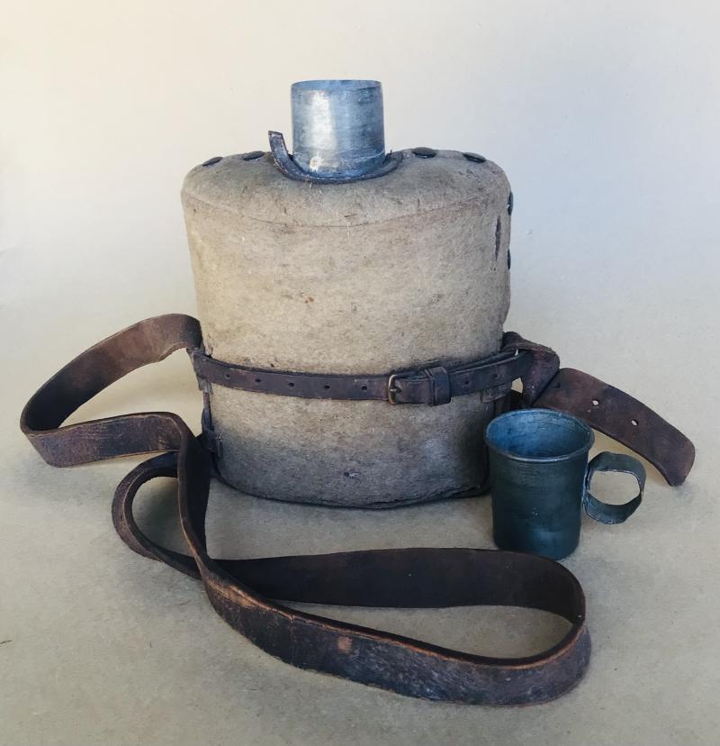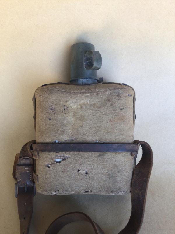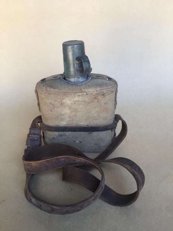 Wool felt cover with brown leather shoulder sling. The tin cup stamped with “AM” air ministry mark and dated 1943. The remains cork rumbling around inside. A good condition example that could still be easily used in a Light Horse Field Ambulance display.