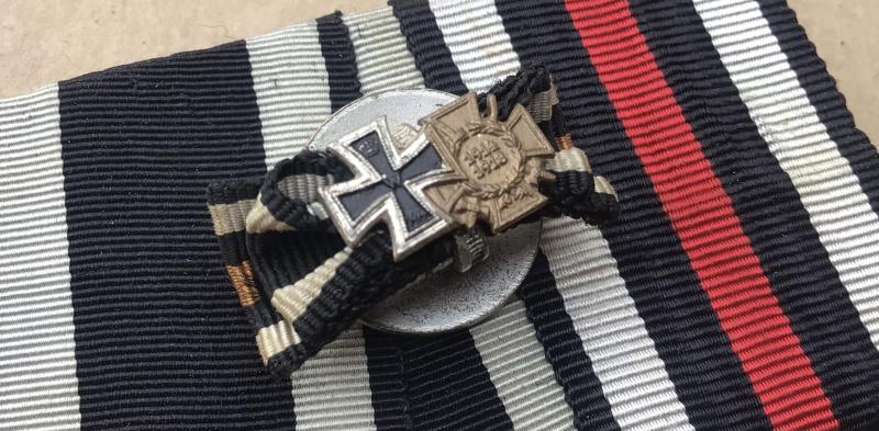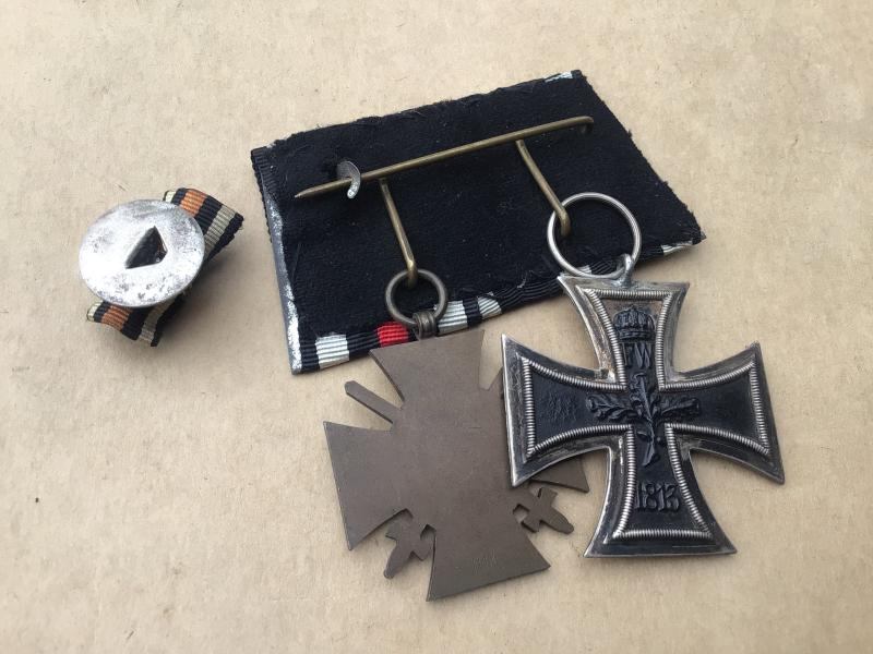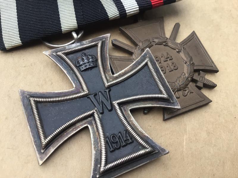 1914 Iron Cross 2nd class and 1914-18 Hindenburg Honour Cross with swords. Original full size medals. Court mounted on a detachable Prussian Ribbon bar.