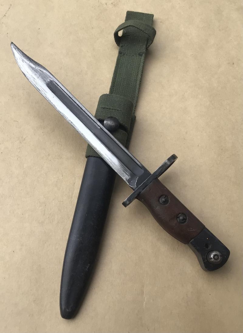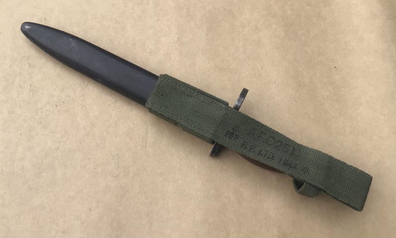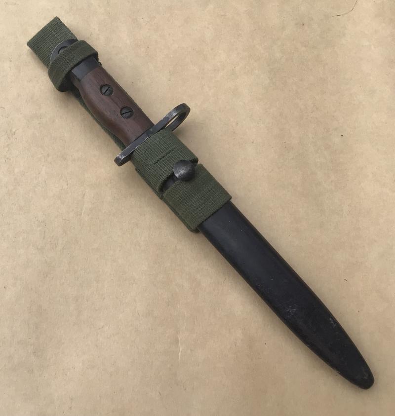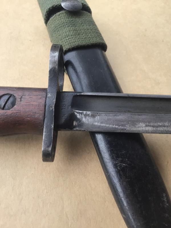 The bayonet is complete with its original, Mk1 scabbard. The scabbard retains its original black finish. Complete with Pattern 44 jungle equipment web frog. This is an excellent example of a scarce No.5 bayonet by Radcliffe, one of the rarer makers.