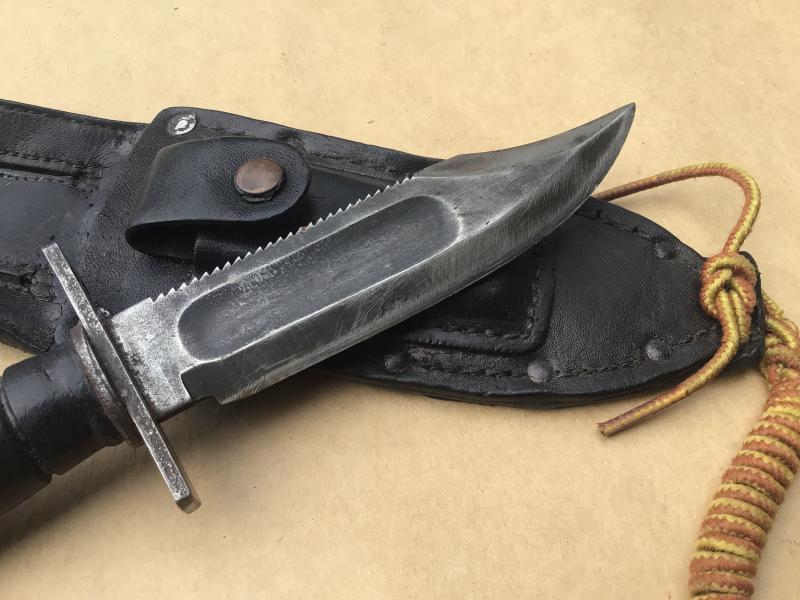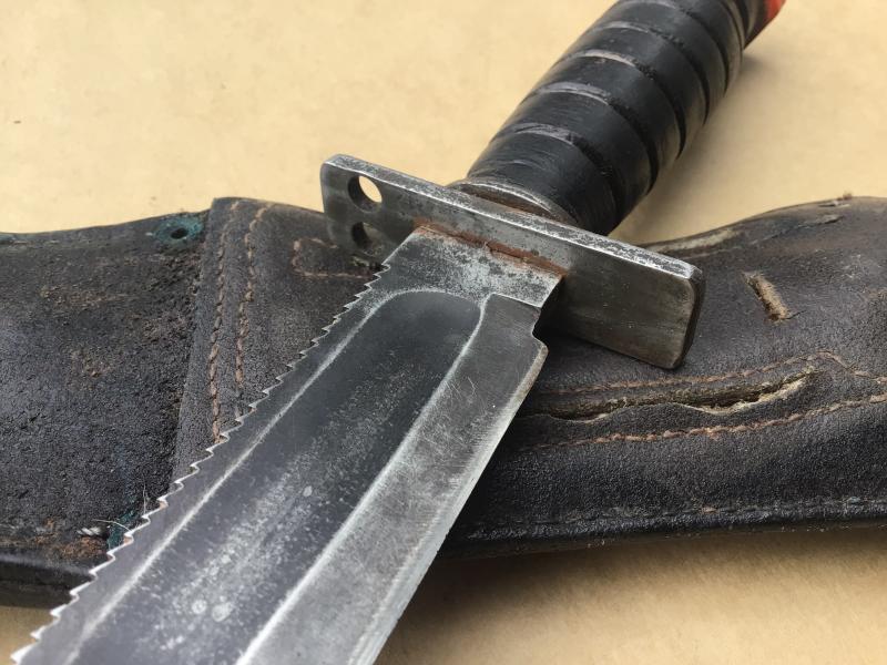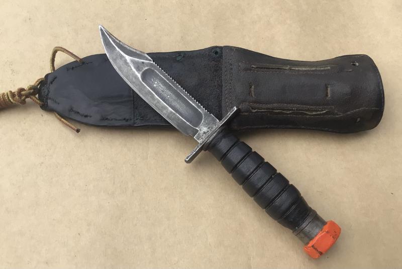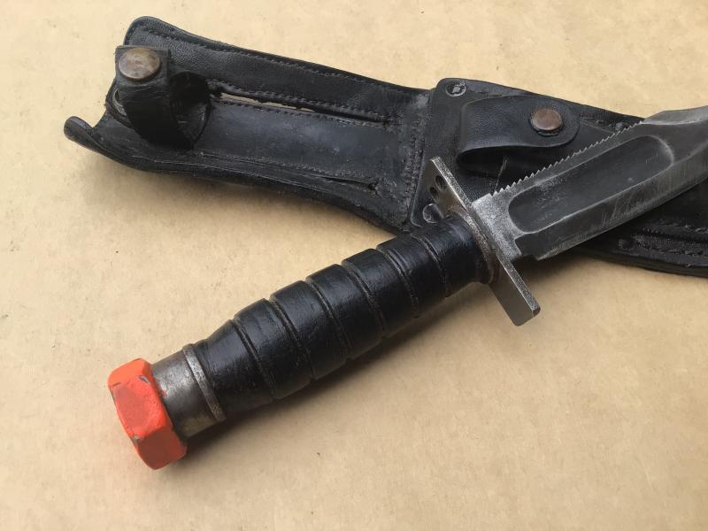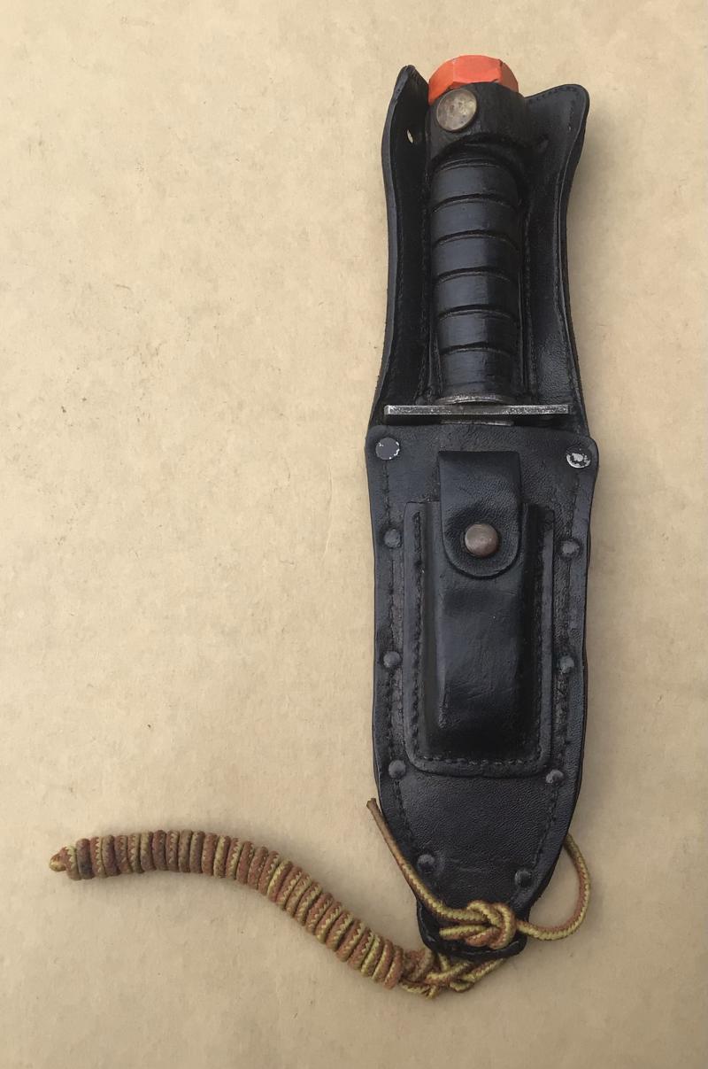 Brown leather “washer” style grip . Unmarked blade and cross guard. The pommel painted orange for night recognition. Comes with its dark brown / black leather sheath , this also unmarked and shows matching age and service wear. Also has the sharpening stone inside the sheath pouch.