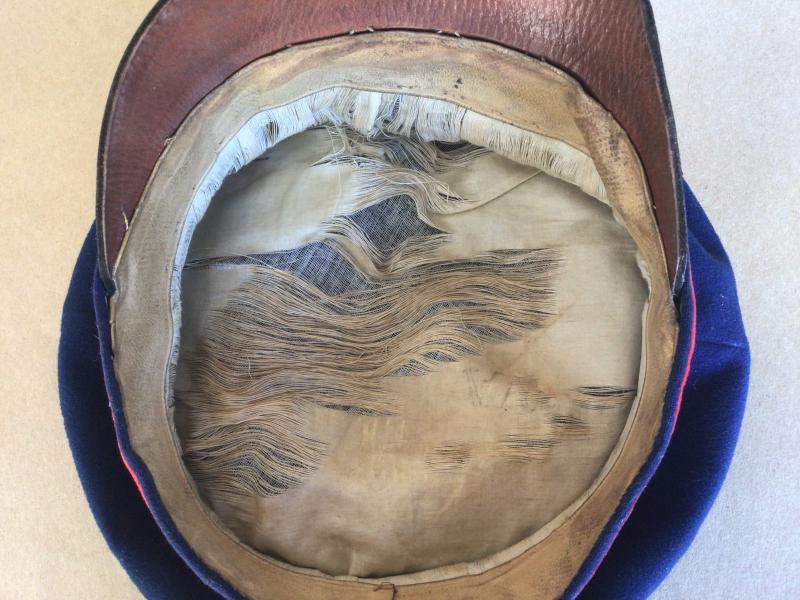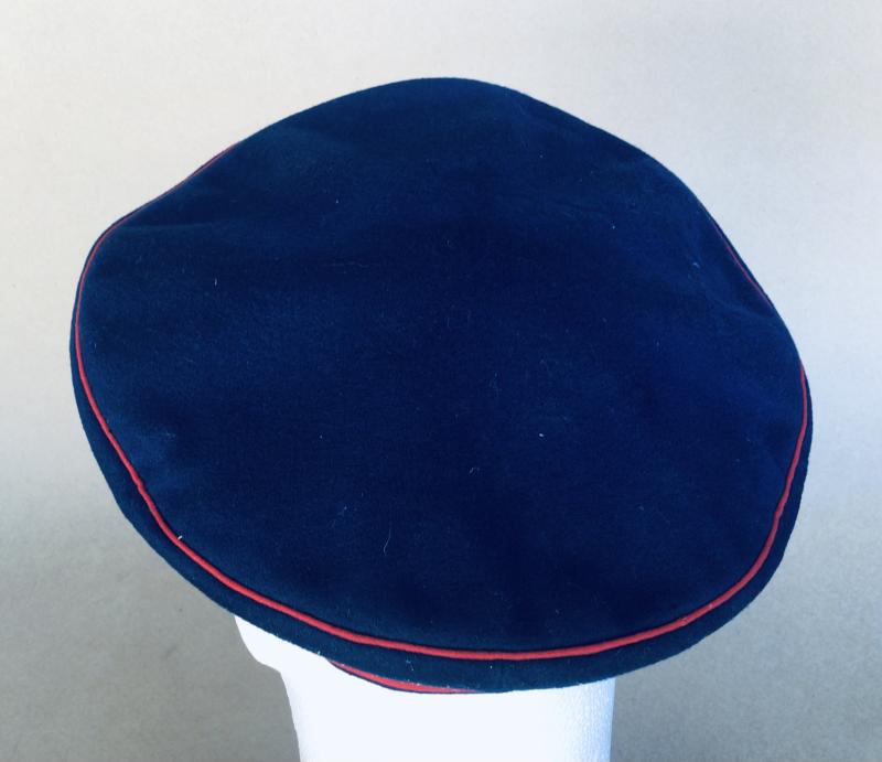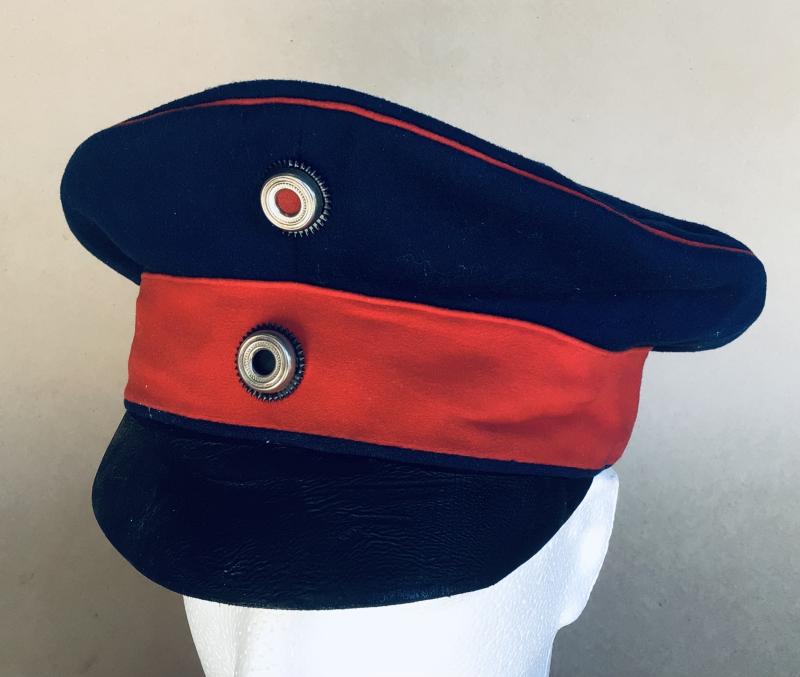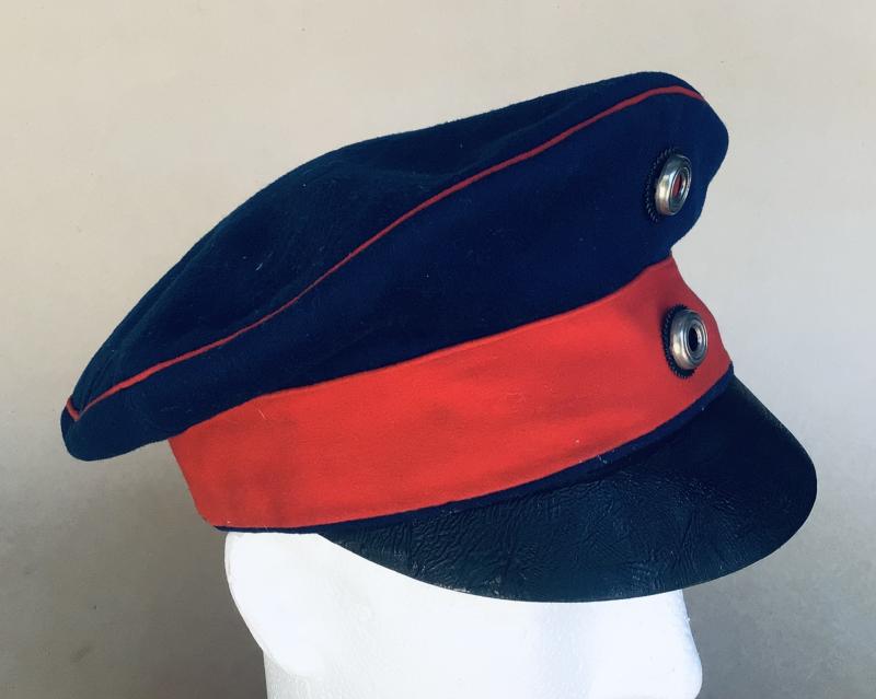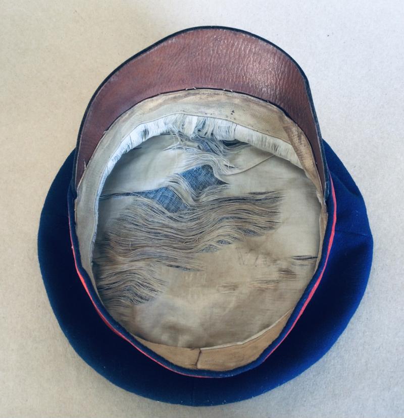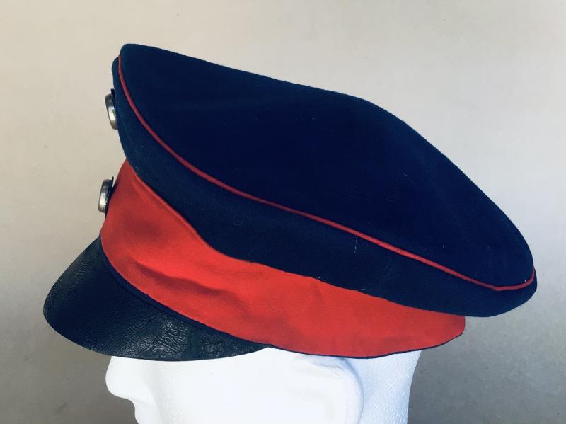 A nice example in dark blue melton wool with scarlet cap band and piping. Black “crusher” style flexiavle black leather visor. Matching officers state and national cockades. Retains its original sweatband. The silk lining is well worn and frayed.