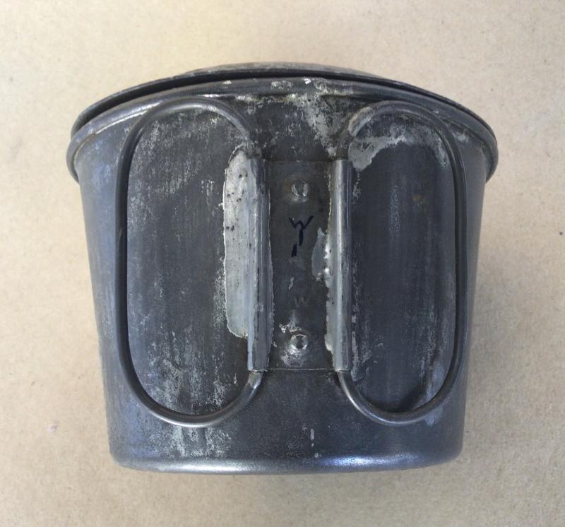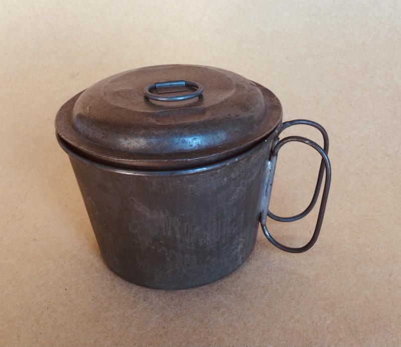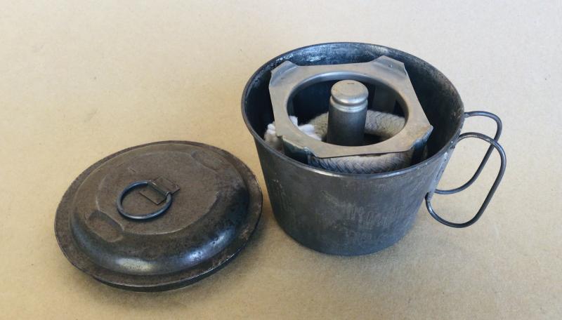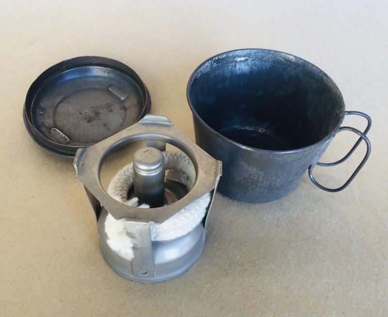 A good example of issue field cup. This pattern dated from WW1 through to the Militia period and also used during WW2. This example maker marked “Willow” and comes with its rare tin lid. The lid not often found and it’s only the cup that usually turns up. Together with a near unused condition field stove that fits perfectly into the cup and the lid can be closed perfectly.