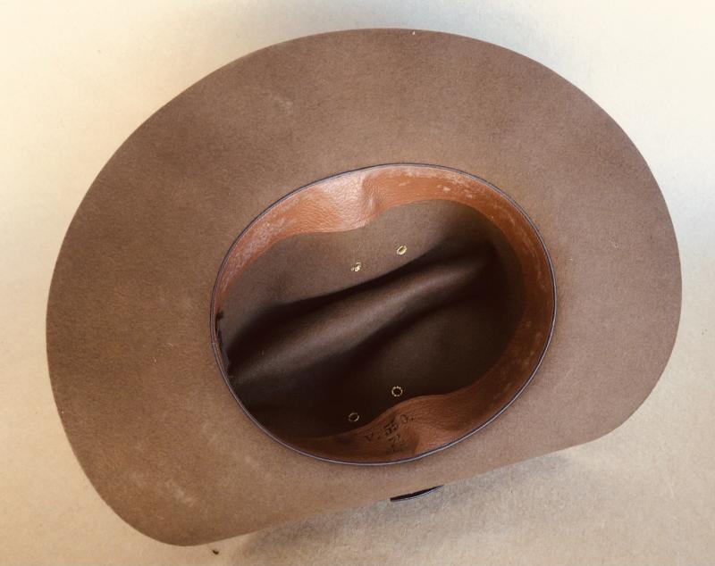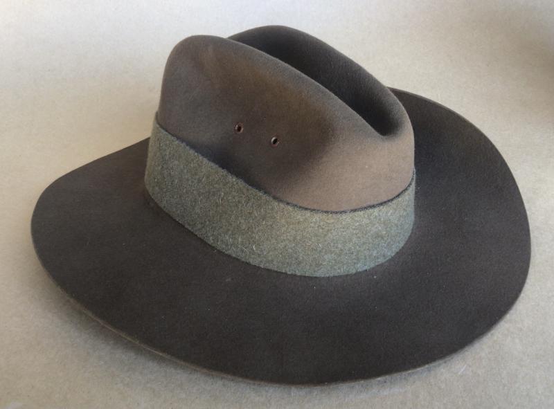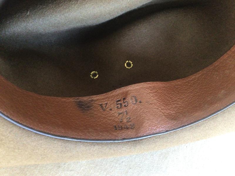 A near unissued example. Khaki fur felt with hook and eye side fastening. AMF khaki wool Puggaree. Near mint condition full size oxidized rising sun hat badge. Leather sweatband maker code marked and dated 1942. No chinstrap.
