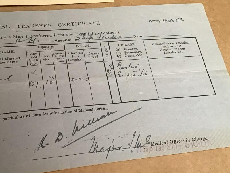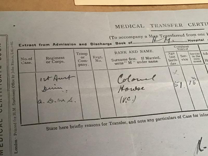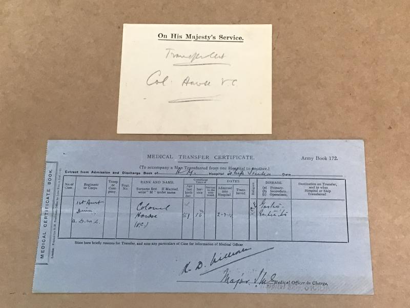 Medical Transfer Certificate to the then Colonel Howse VC as having been admitted to the HMHS Sicilia on 2nd august 1915 with Gastroenteritis during the Gallipoli Campaign. Details inc Age 51 with 16 years of service Colonel Howse (VC) 1st Aust Div AAMS.
