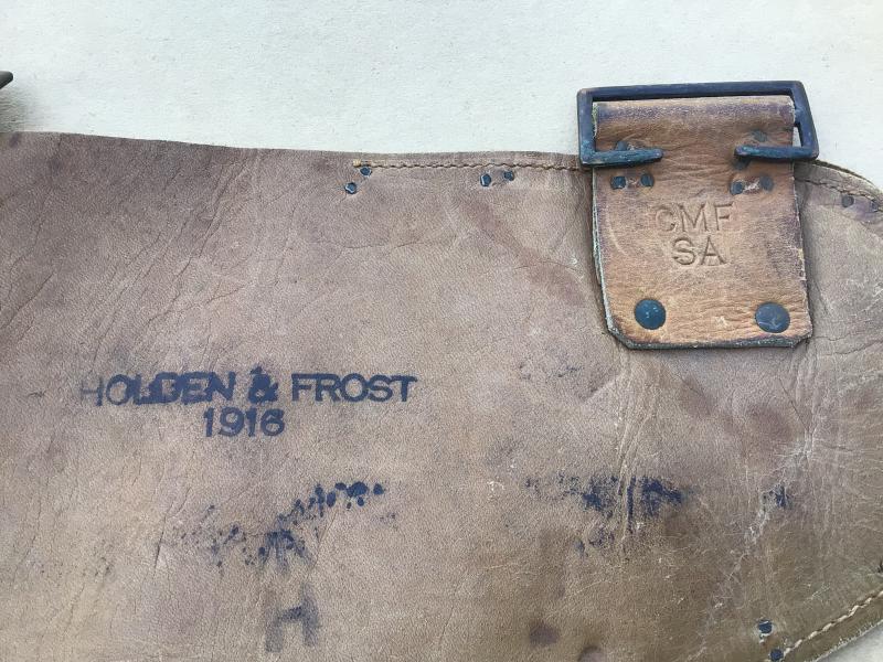 A rather hard time to find. This example is in near unissued condion. Clearly maker marked in ink. And dated 1916. Has seen post war Militia period use with a South Australian CMF ( Militia) stamp.