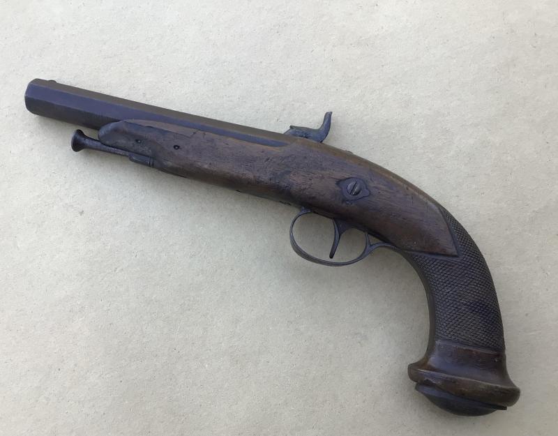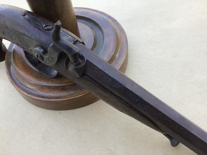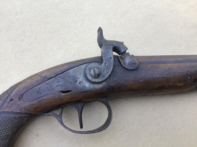 Complete with metal ram rod. Cedar wood body with pressed checkered grip. All metal parts with acanthus floral leaf design. No markings at all. Approx overall 330mm long.