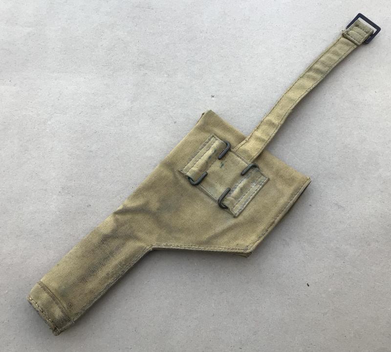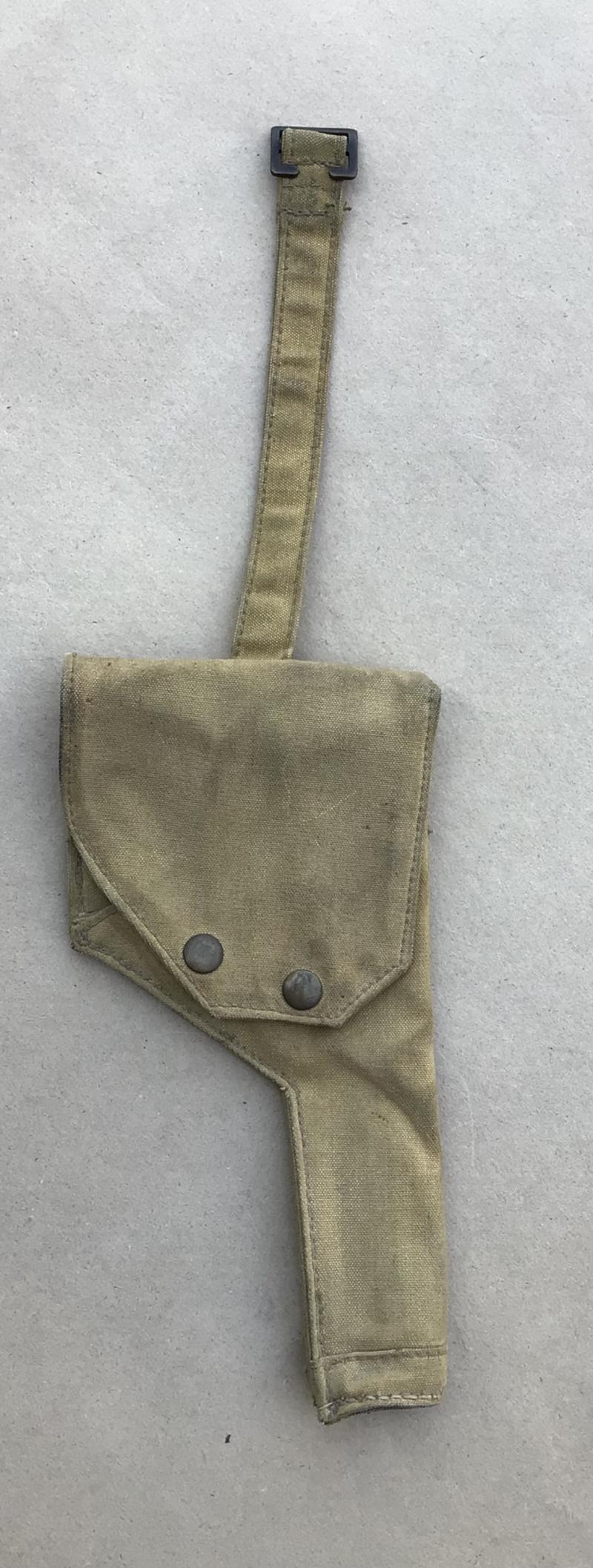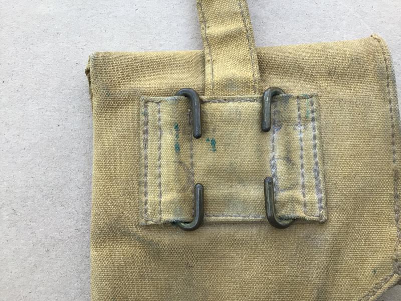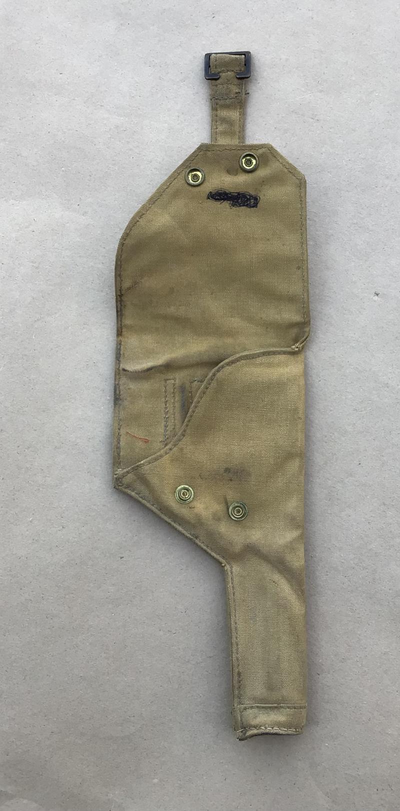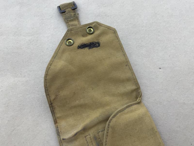 A rare mid to late war economy pattern in khaki canvas duck. Press stud closure with brass press, studs marked “Carr Australia”. complete with long integral auxiliary shoulder strap, the maker mark and date on the reverse now illegible. A scarce pattern not frequently encountered.
