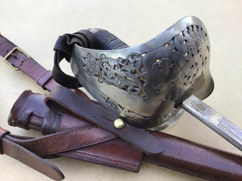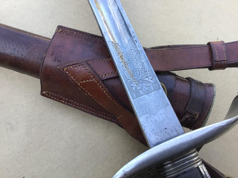 Straight broad, single fullered blade , acid etched with floral design and imperial crown. Proof mark to the ricasso as well as retailers name “ C Anderson” of “Sydney”. Voided bowl guard with a very decorative VR cipher and complete with brown leather sword knot. The ray skin wire band grip in very good condition and comes with its leather covered wooden scabbard, This complete with brown leather Sam brown frog is marked for first world war. “CGHF “ Commonwealth government harness factory.