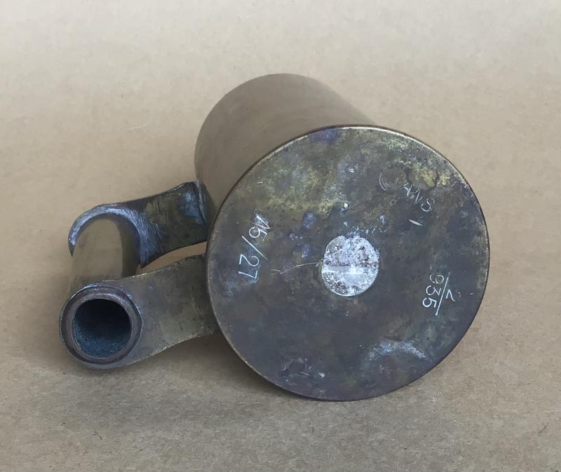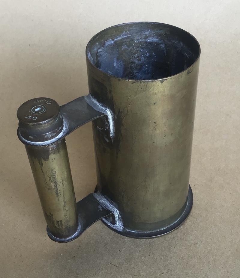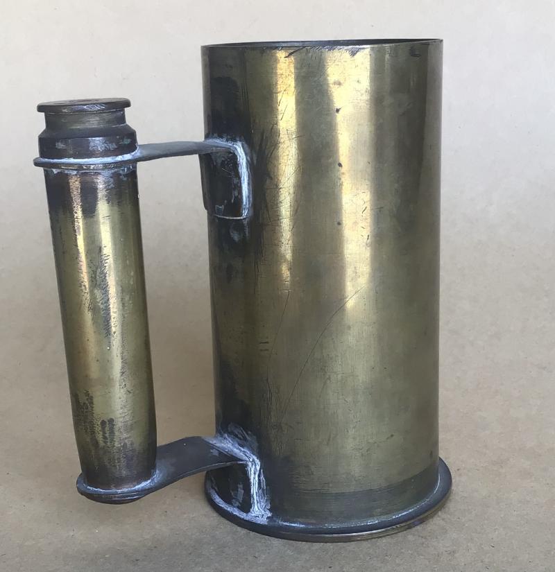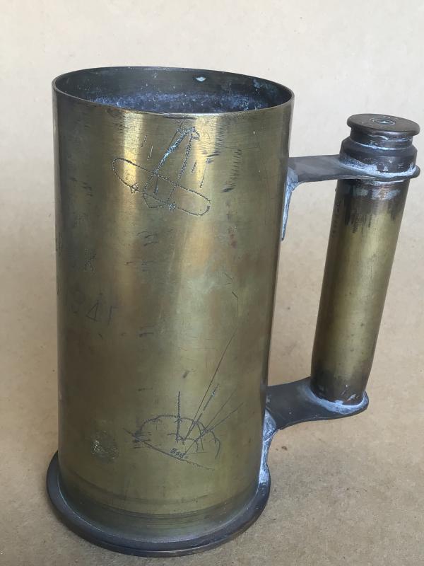 Made from and Italian artillery case cut down to tankard size. 75mm x 158mm. The sides crudely but pictorially engraved with a scene of a German dive bomber diving and an exploding bomb going off and “Tobruk Aug 1941”. The handle an Italian 20mm shell case marked “BDP 40”. These artillery cases clearly souvenired from the former Italian fort of Tobruk.