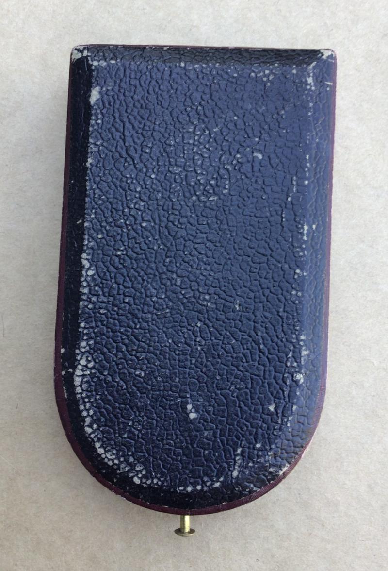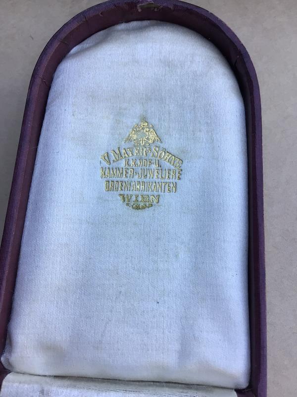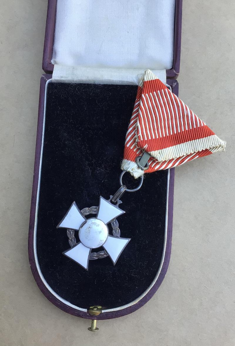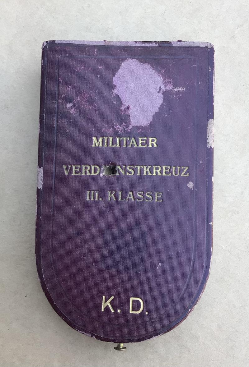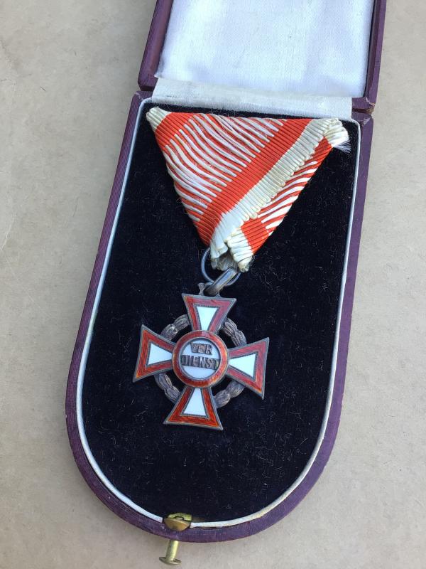 A fine quality manufacture first war Austrian Military Merit Cross Third Class with War Decoration; a silver cross pattée with the arms of the cross with red and white enamels, along with a laurel wreath between the arms; the obverse with a central white enameled medallion, inscribed “Verdienst” (German - Merit) in silver lettering; the reverse completely in white enamels; on a squared loop for suspension, with its period original tri-fold ribbon; measuring 30.83 mm x 31.46 mm; weighing 17.3 grams. Accompanied by its original case of issue; constructed of heavy pressed paper, with a faux leather (leatherette) exterior; lined interior lid - marked “V Mayer Sohne Juweliere Wien” in golden lettering; recessed medal bed; functional spring catch with stud release; intact fabric hinge catches; functional dual exterior metal hinges; measuring 60 mm x 105 mm. The top of the case with very heavy scuffing and a hole through the center.