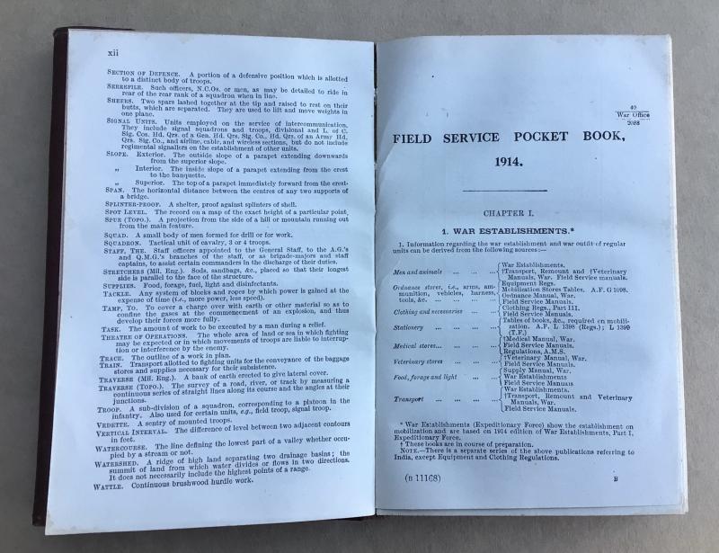 1914 dated War Office Instructional Pam with oilcloth cover. Soft cover 291 pages. Covers all basic aspects of military service with instructions and diagrams. Used but in VGC.