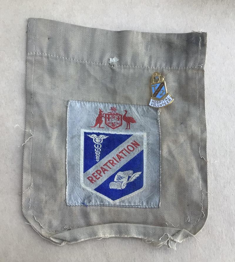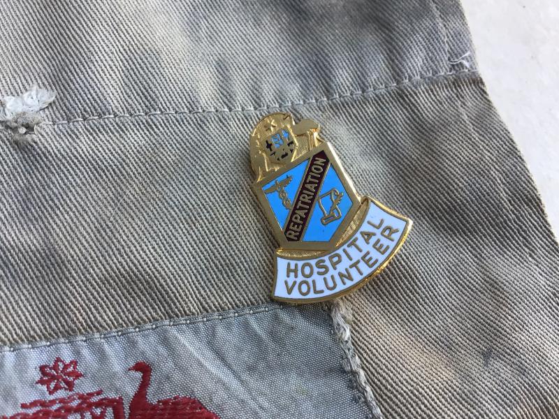c/1970’s Removed from a working dress uniform a khaki cotton pocket with attached woven Repatriation Hospital patch. Also includes a gilt and enamel “Hospital Volunteer” official lapel badge. This with brooch pin and rolling catch.