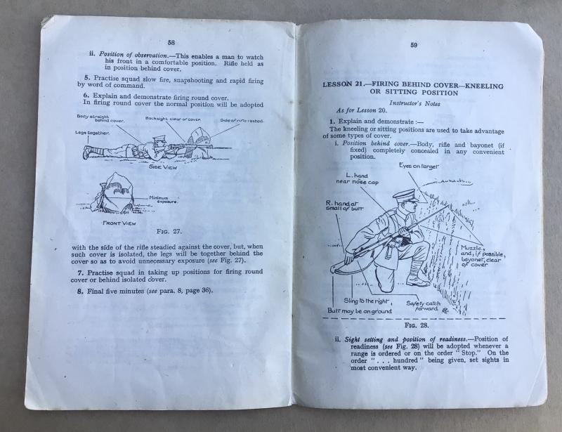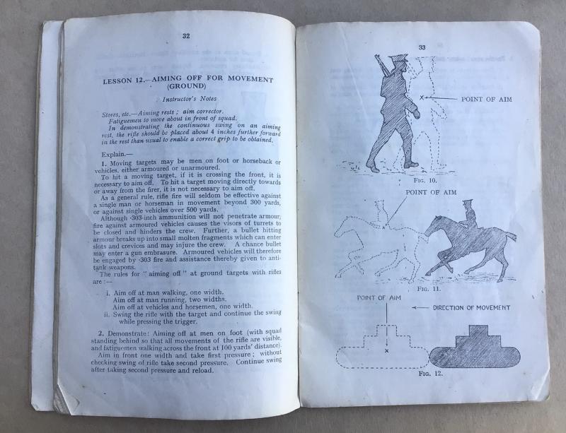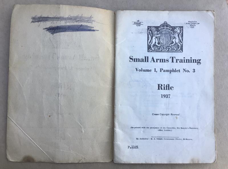 British War Office “Small Rms Training Vol 1 Pamphlet No.3 Rifle 1937.” Melbourne printer marked. Shows age and use with a tatty spine , crease marks to the covers and dog ear corners.
