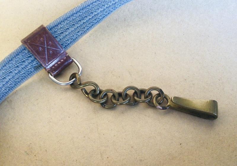 The belt is constructed of woven blue cotton with brown leather and white metal buckle along with a small brass linked chain hanger.
