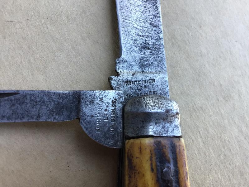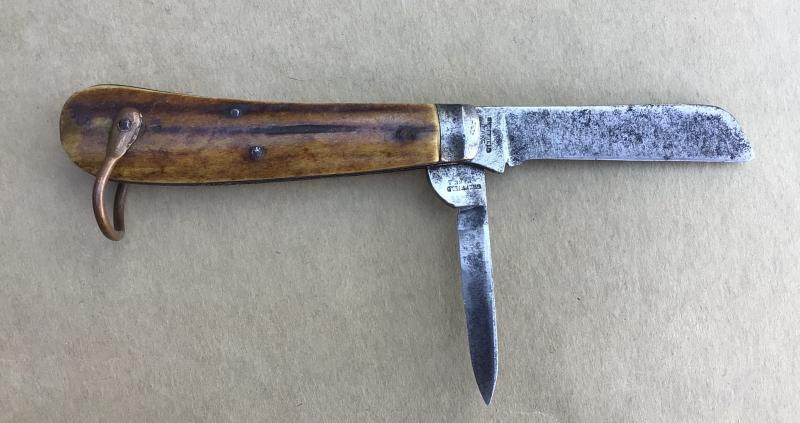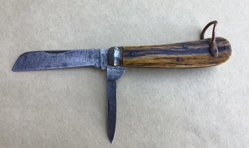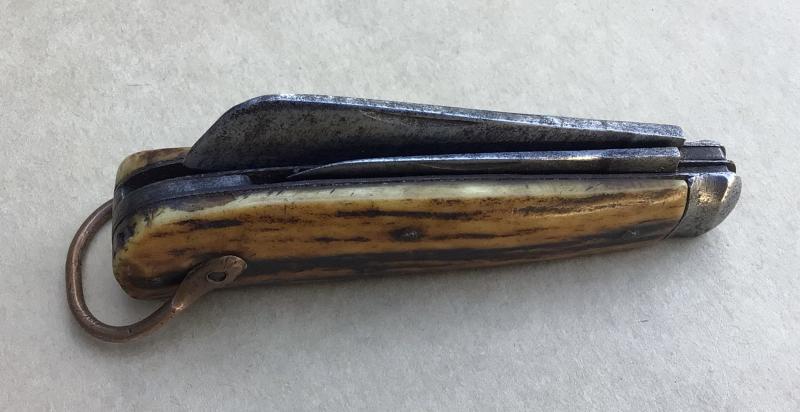 Two blade by Richard Melhuish of Holborn London. Horn grips and copper shackle. Overall good condition.