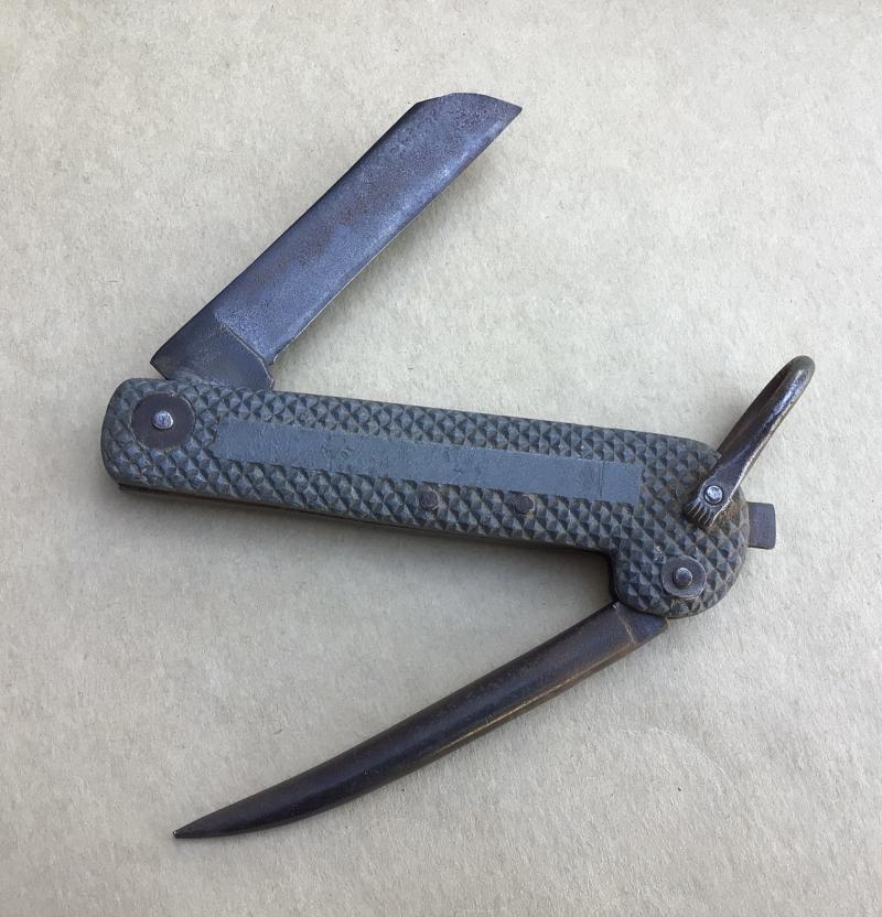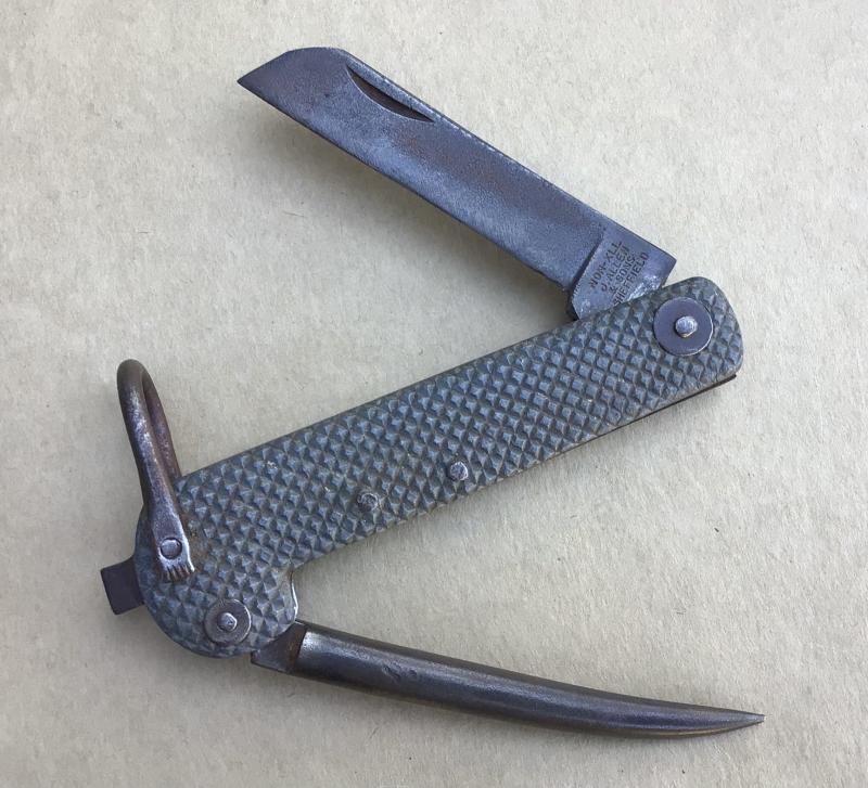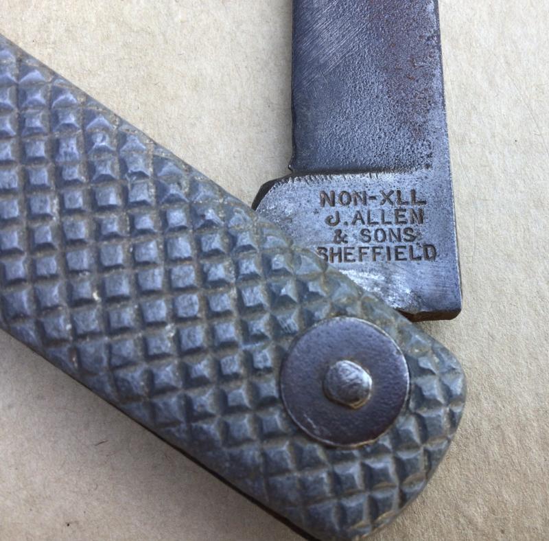 Heavy Duty Two blade knife by J Allen and Sons. Sheffield. Alloy grips. Blade and Marlin spike. Steel shackle. No date.