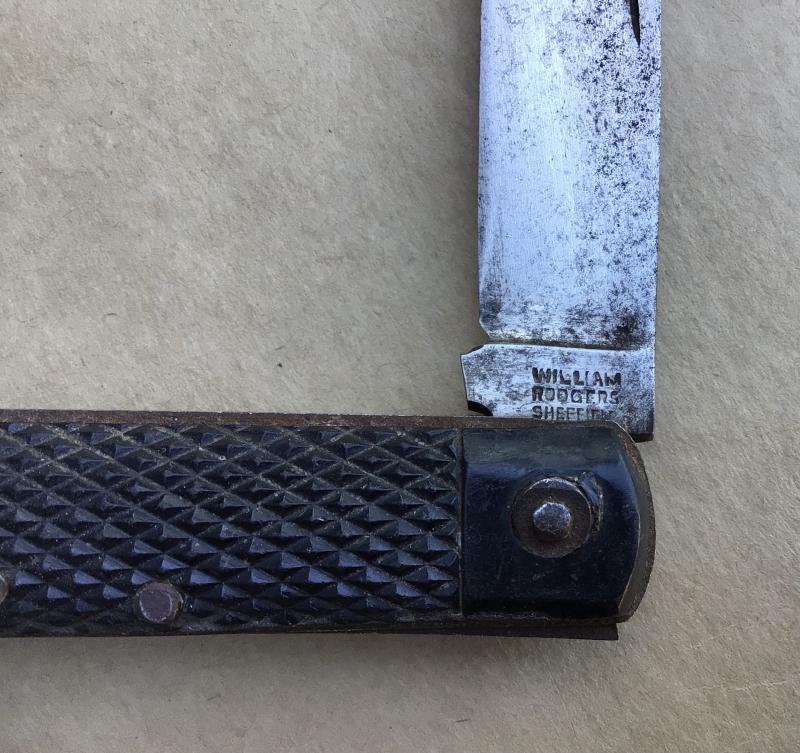 Two blade by William Rogers. Blade and and marlin spike. Black Bakelite grips with steel shackle. No date or military acceptance stamps.