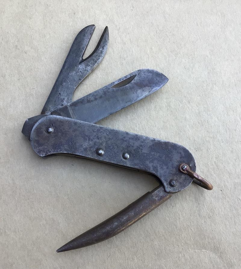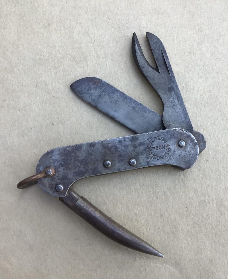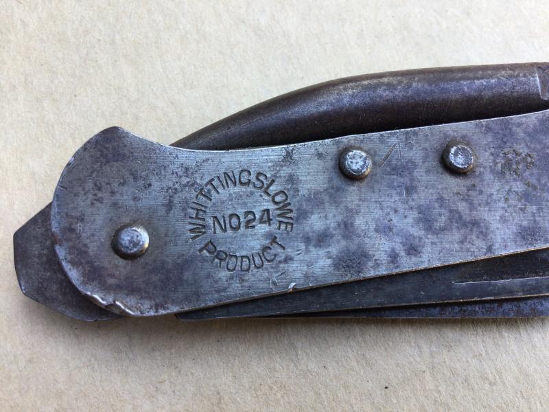 All steel three bladed first pattern clasp knife. Blade, crab claw opener and marking spike. Maker marked “Whittingslowe Product No.24” copper shackle. Heavy tone and need a good clean.
