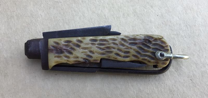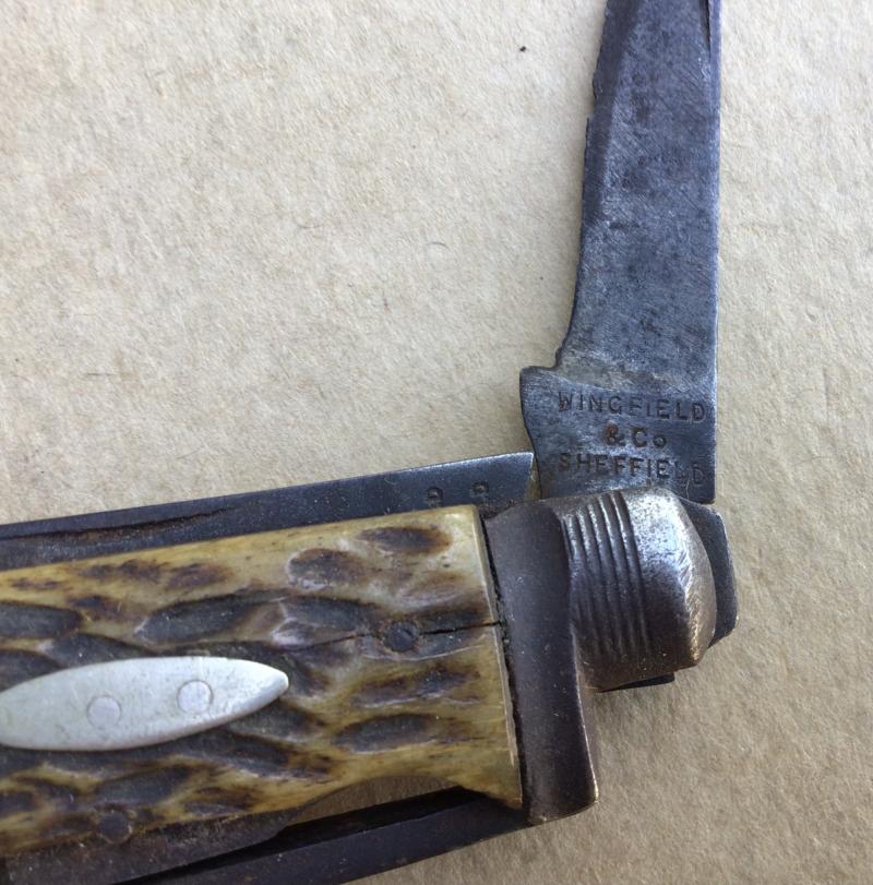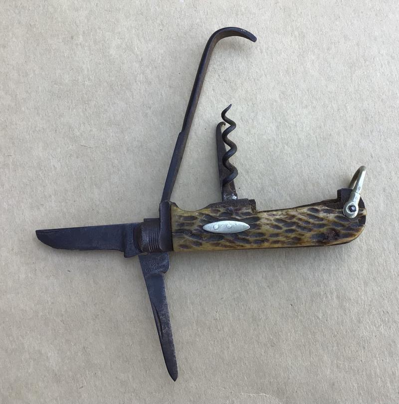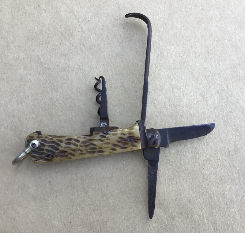 A Boer War to WW1 period private purchase Wingfield and co Sheffield. Multi tool with two blades, both very well worn down to nearly nothing. Cork screw, lace puller and frog cleaning tool. Horn gripps and a white metal shackle.