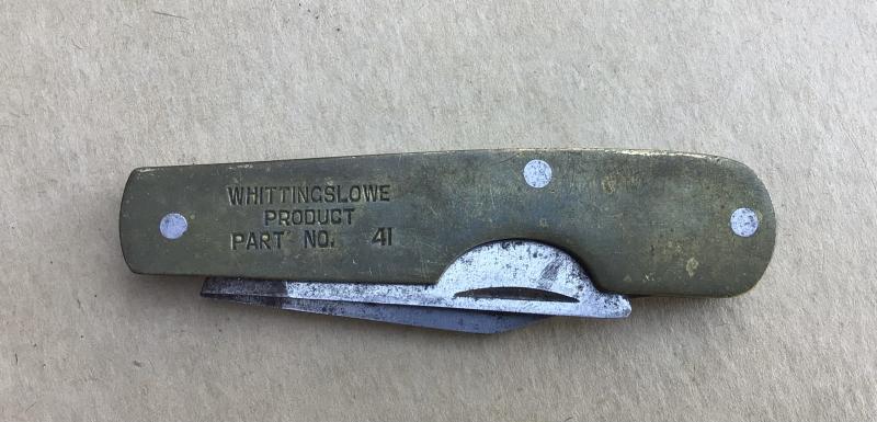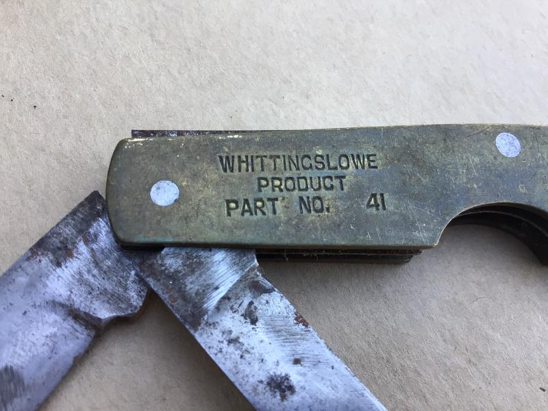 Two bladed commercial pattern knife. Skinning blade and cutting blade. Brass gripes marked “Whittingslowe Product Part No.41.”