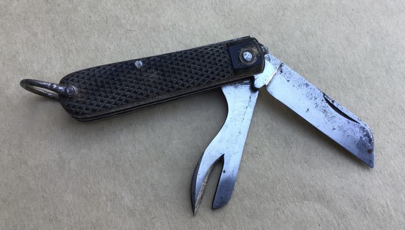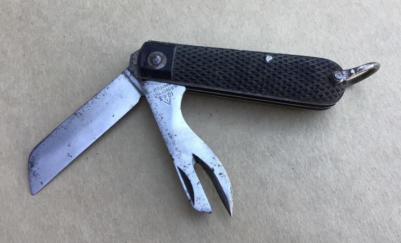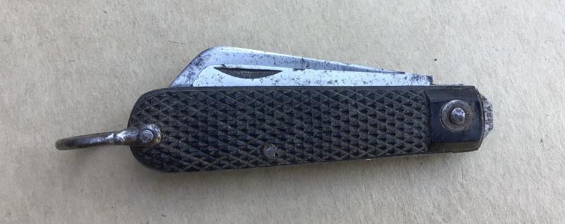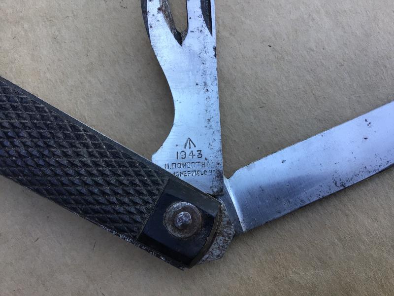 Two blade knife by H Rowbatham Sheffield. Blade and crab claw opener. 1943 dated and broad arrow marked, black Bakelite grips and steel shackle. Used but good condition.