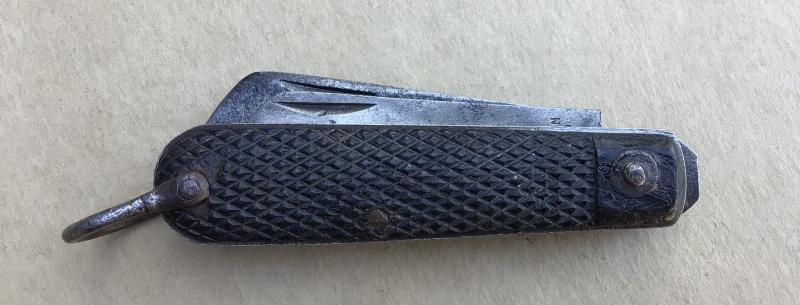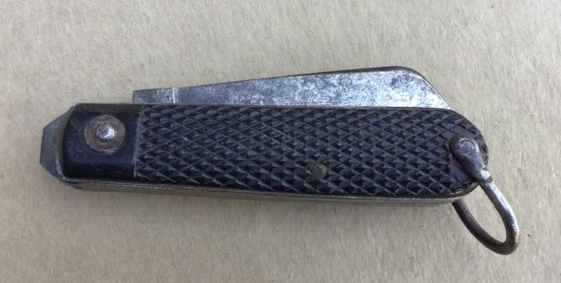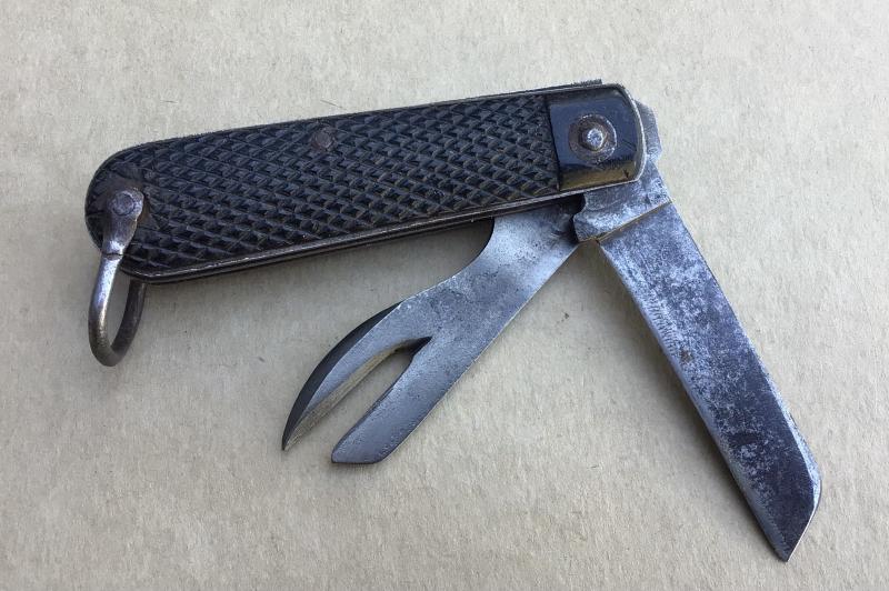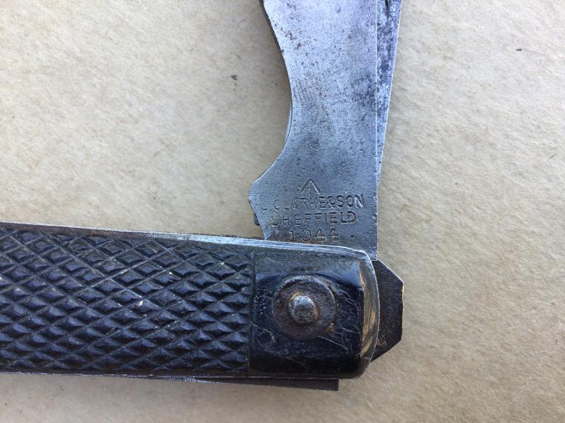 Two blade knife by Clarke and Son Sheffield. Blade and crab claw opener. 1944 dated and broad arrow marked, black Bakelite grips and steel shackle. Used but good condition.