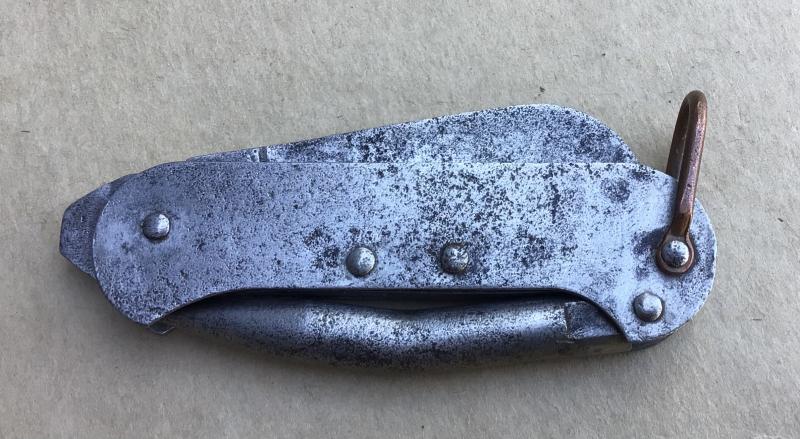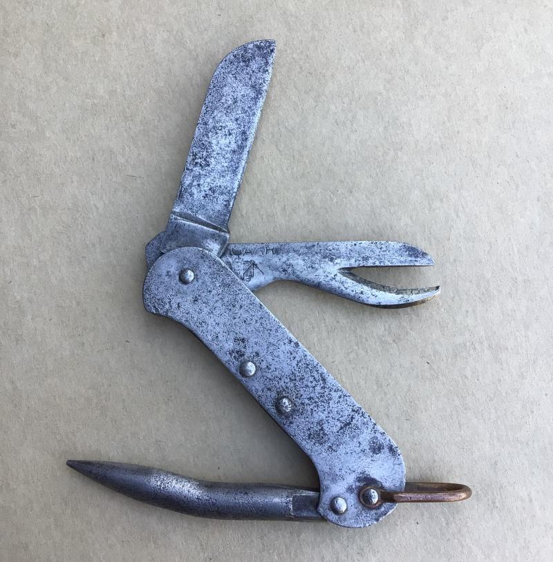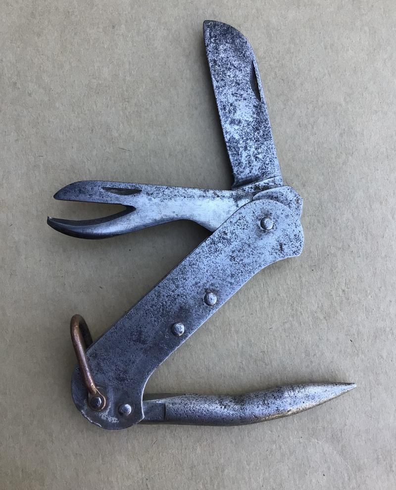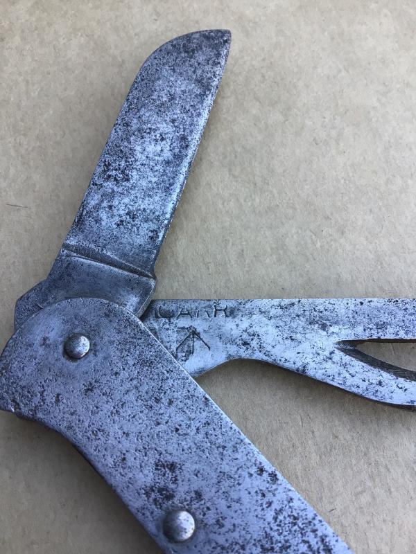 A First pattern WW2 example produced three bladed knife by Watts”CARR”. Blade , crab claw opener and marlin spike. Marked “CARR” over a broad arrow.
